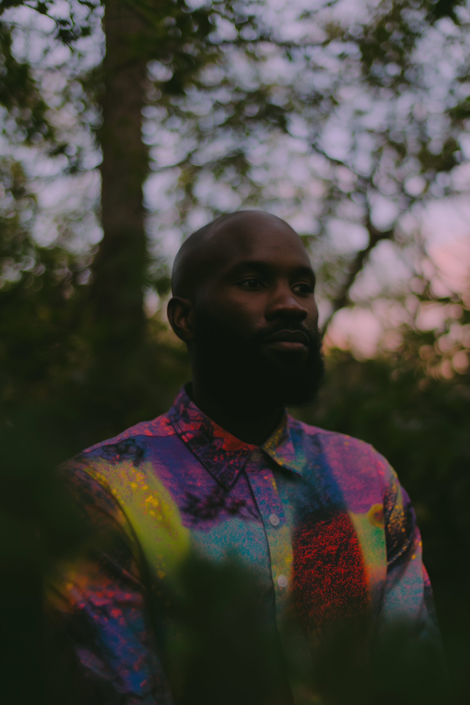 Man in colorful shirt amidst a softly lit nature setting, with blurred tree branches in the background giving a serene feel.
