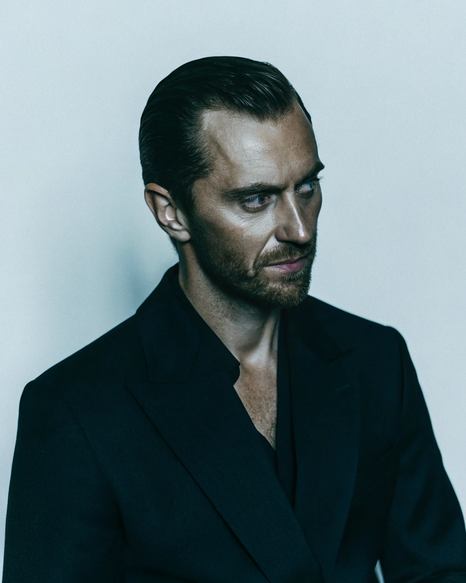 Man with slicked-back hair, beard, and piercing blue eyes in a dark suit against a pale blue background, looking contemplative.
