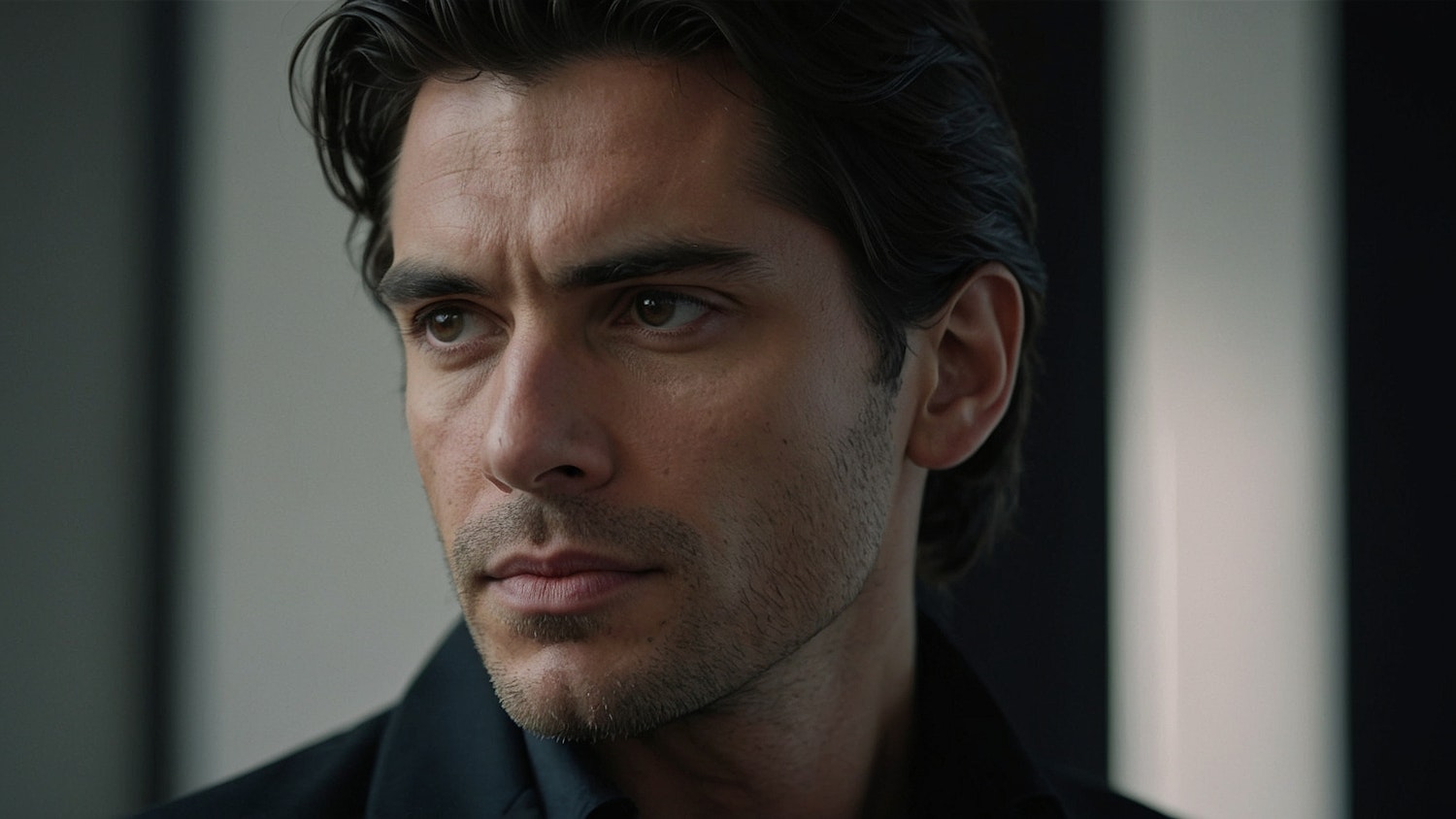Close-up of a man with dark hair and stubble, looking serious. Blurred striped background adds depth to the intense portrait.