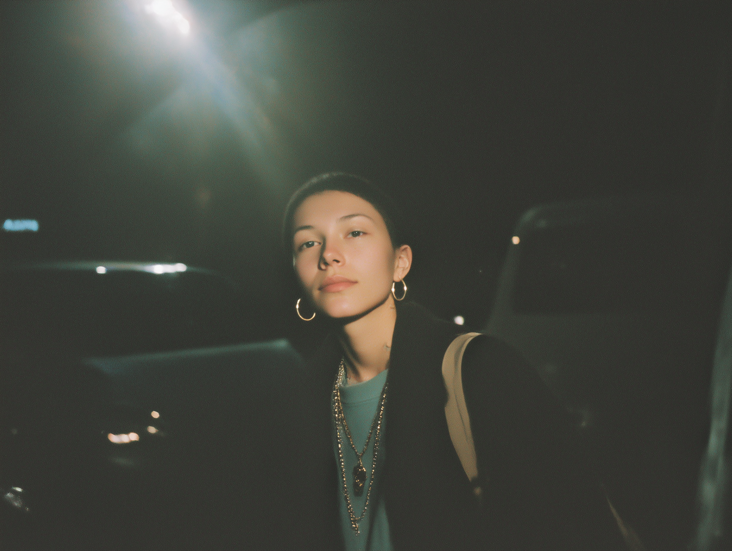 A young woman in a dark jacket and gold accessories gazes calmly at the camera in a dimly lit outdoor night setting.
