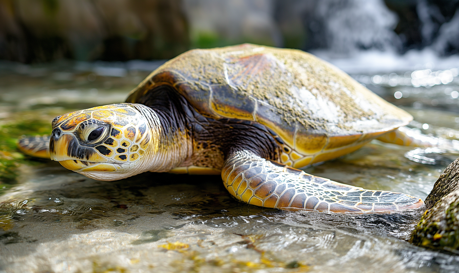 A sea turtle with a textured shell rests on a rocky shore, its flippers in clear water, under bright sunlight.