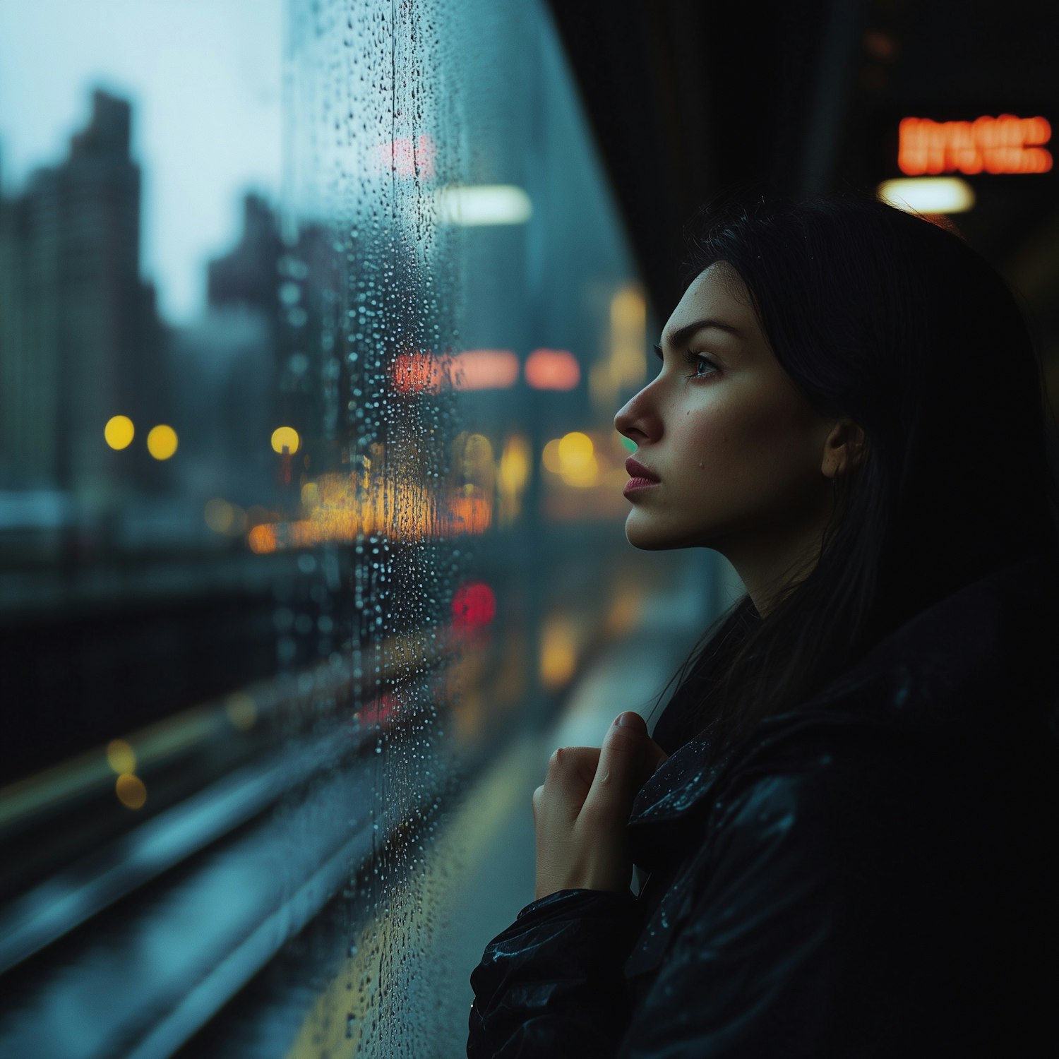 A pensive woman gazes out a rain-speckled window at a city train station, illuminated by blurred urban lights in a moody evening setting.
