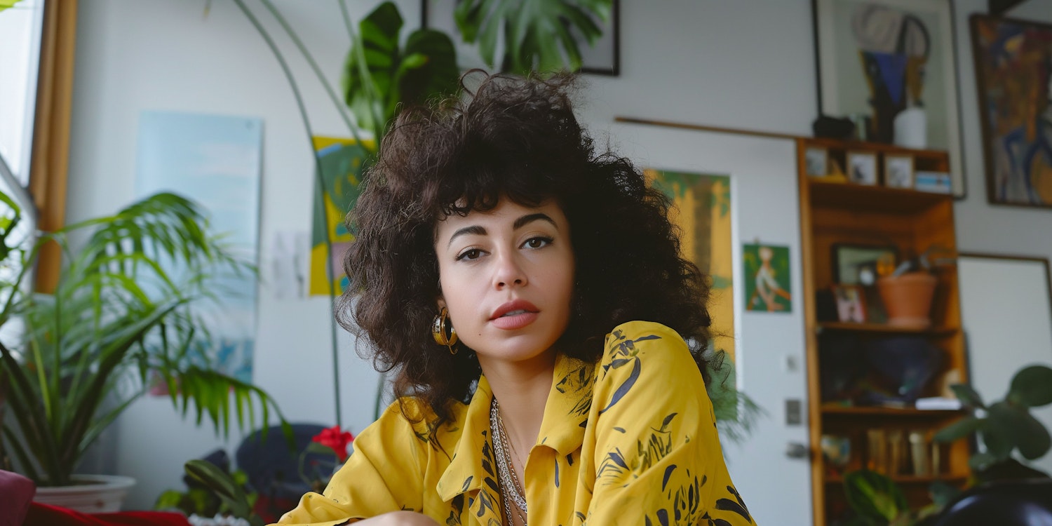Woman with curly hair in a yellow floral shirt, surrounded by plants and art, exudes confidence in a bright, artistic room.