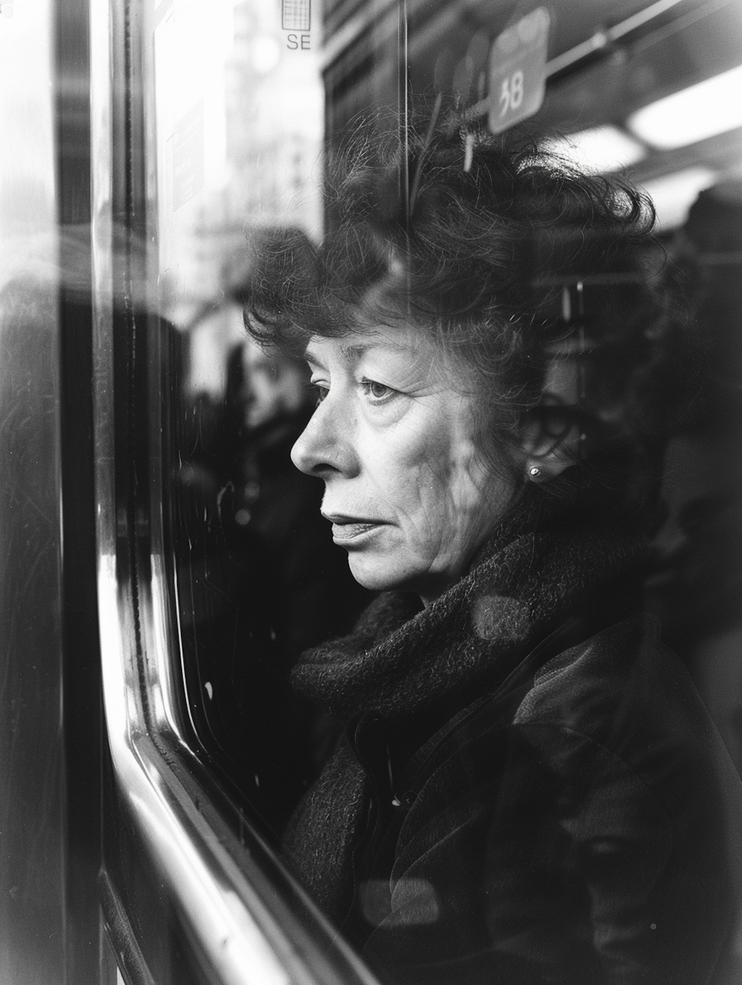 Black-and-white photo of a woman gazing out a window, her expression contemplative. Reflections and blurred background add depth.