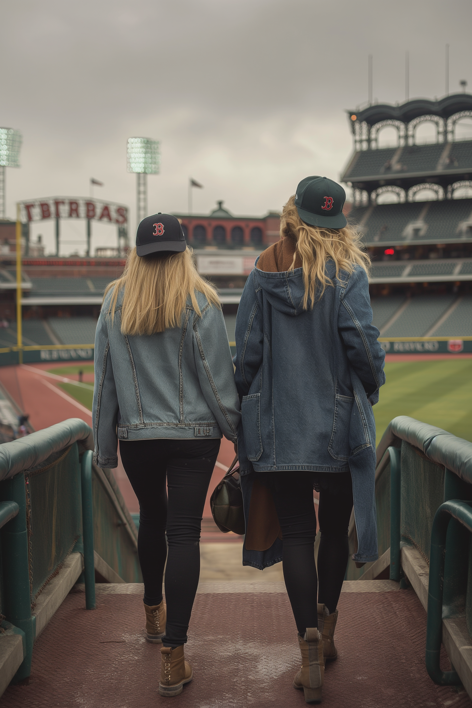 Two women in denim jackets and Red Sox caps walk down a ramp in an empty baseball stadium under an overcast sky.