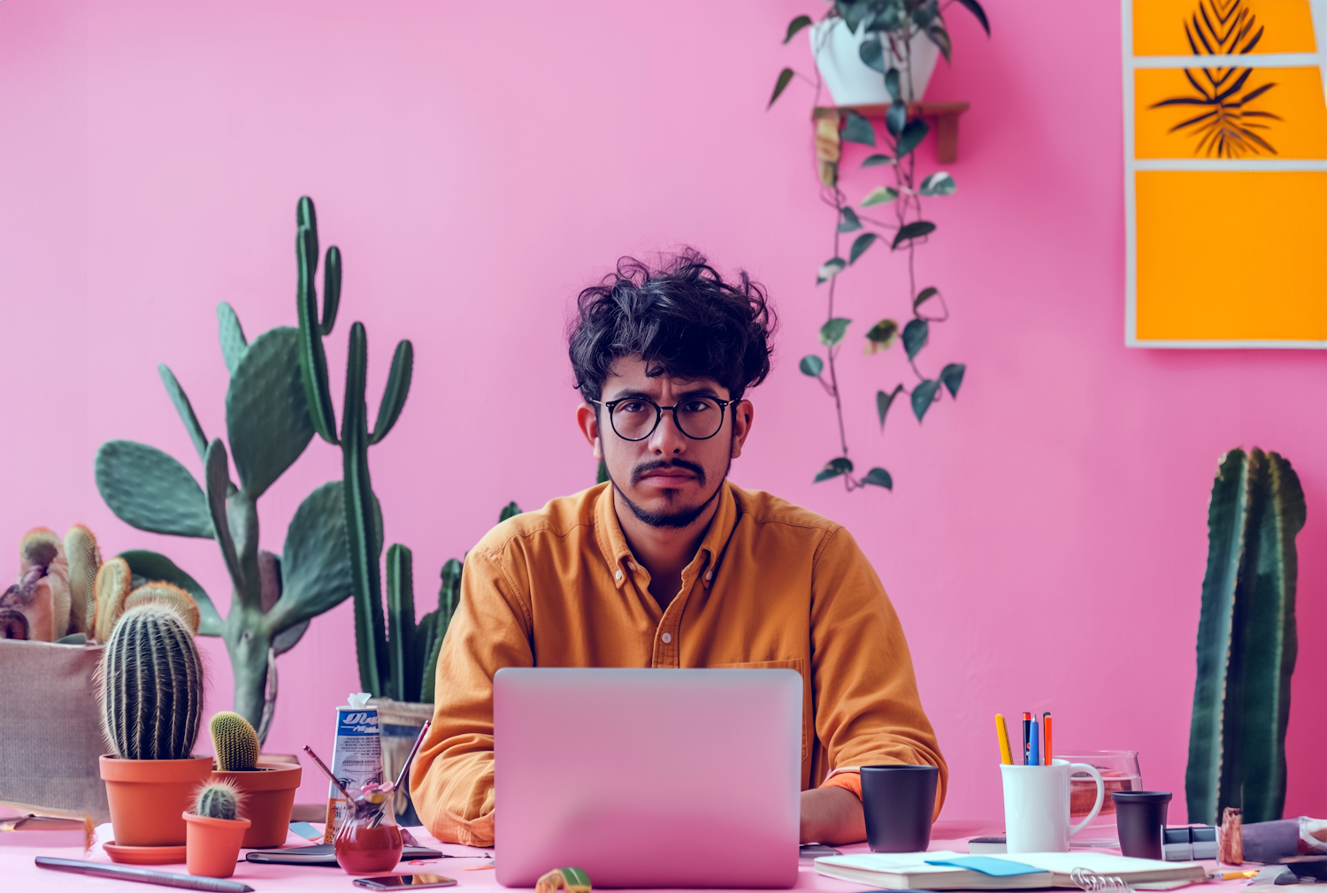 Man with curly hair and glasses working on a laptop, surrounded by cacti, against a pink wall. Vibrant and creative workspace.