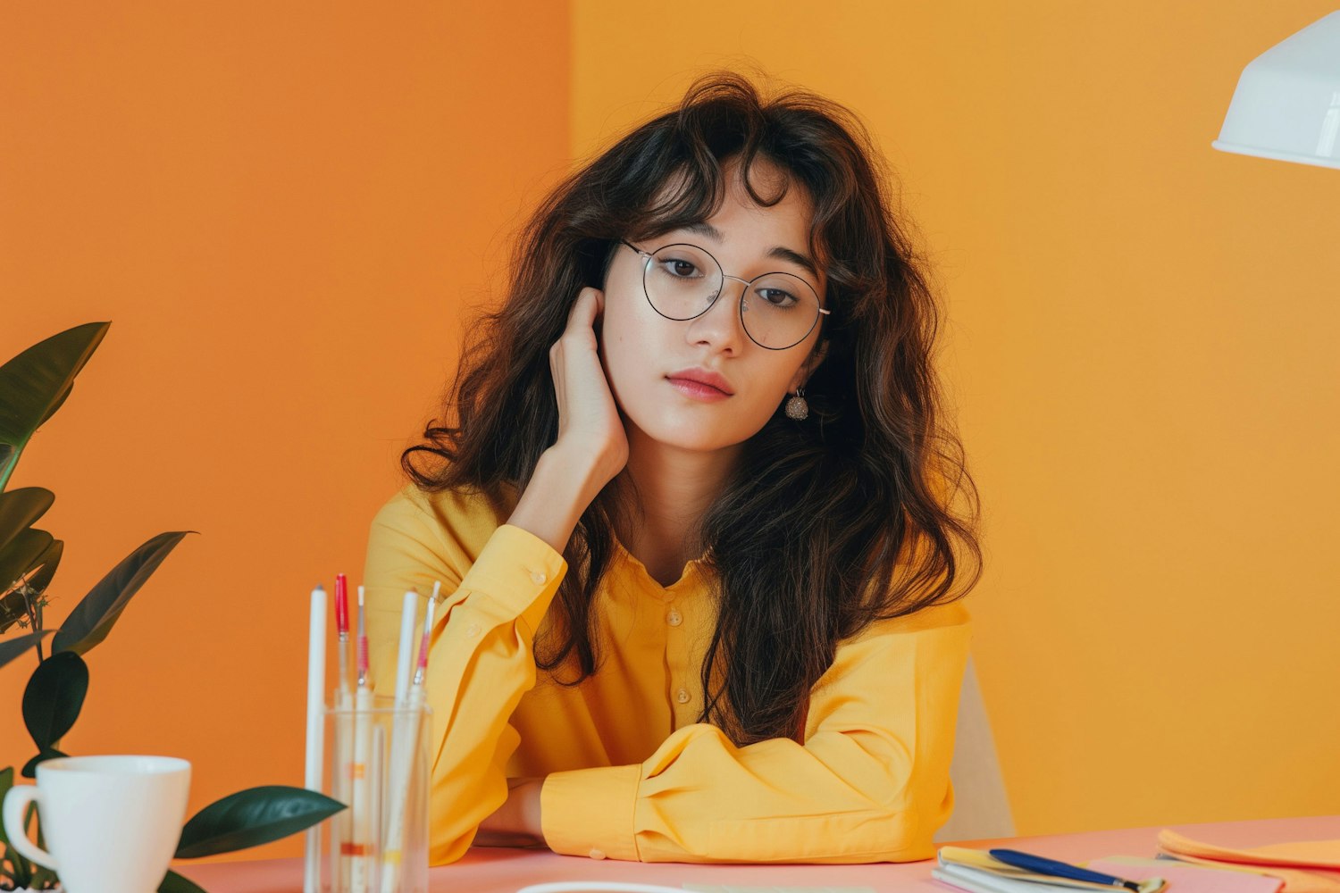 Thoughtful young woman in yellow shirt with glasses at a desk, surrounded by pens, a mug, and a plant, against an orange background.
