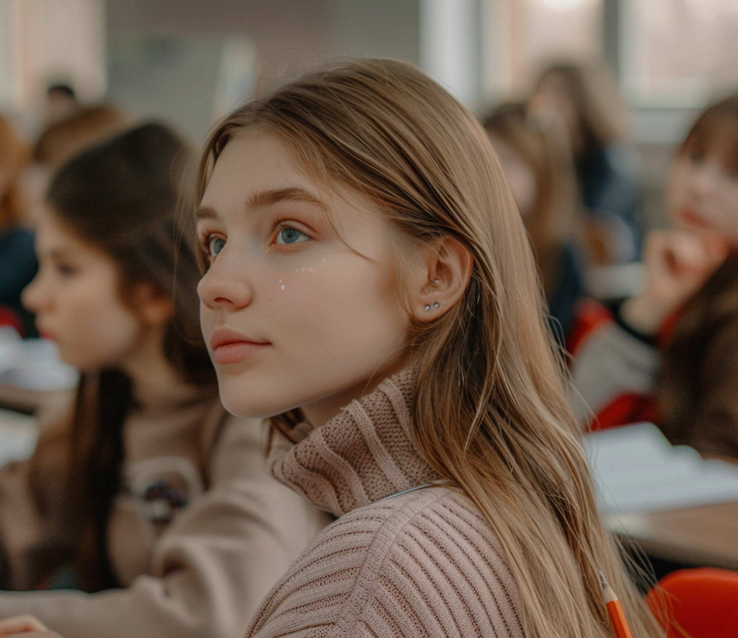 Young woman with light brown hair and blue eyes attentively listening in a classroom setting, wearing a turtleneck sweater.