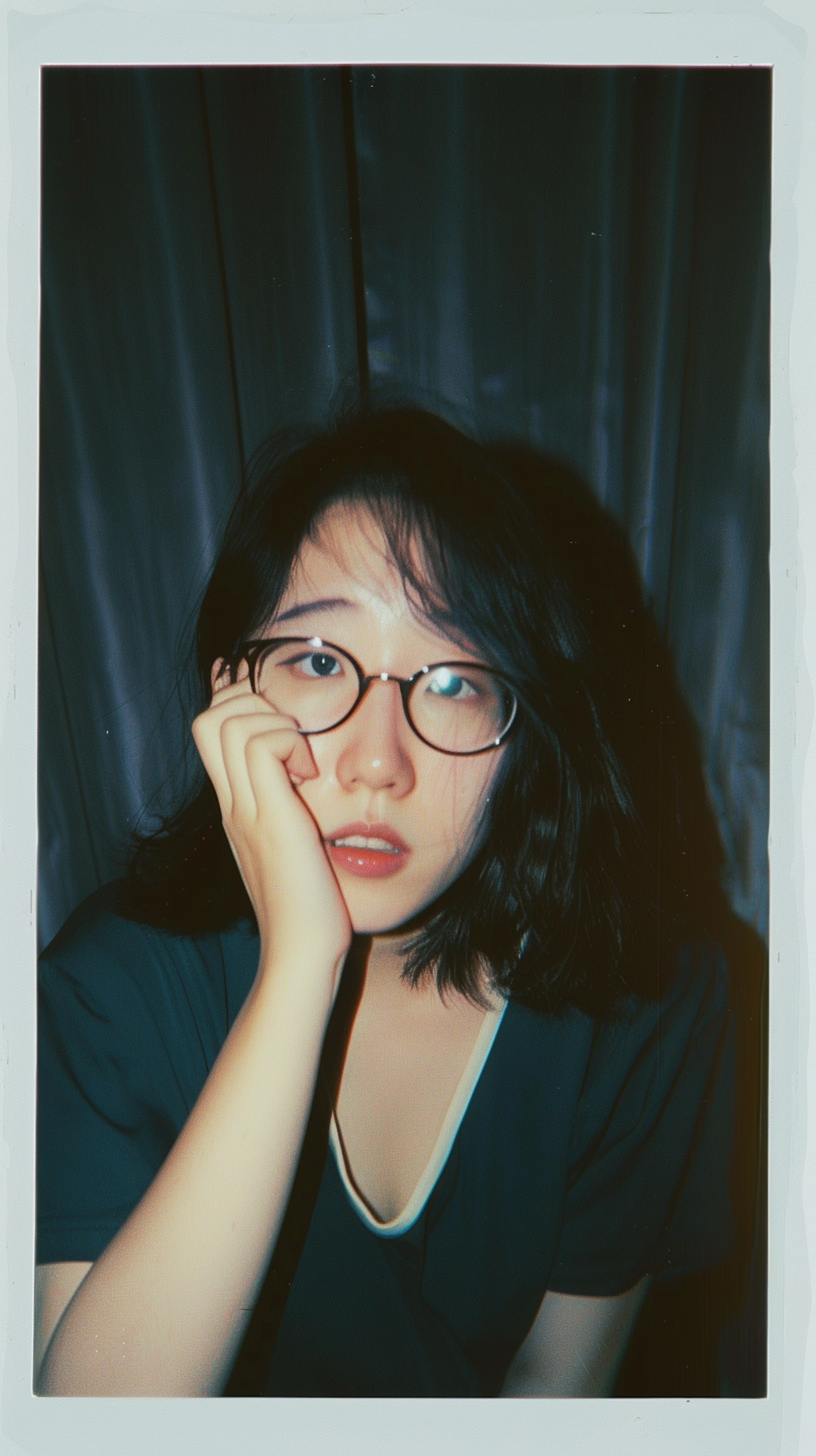 Asian woman with glasses and dark hair, looking thoughtful with hand on cheek, against a dark background.