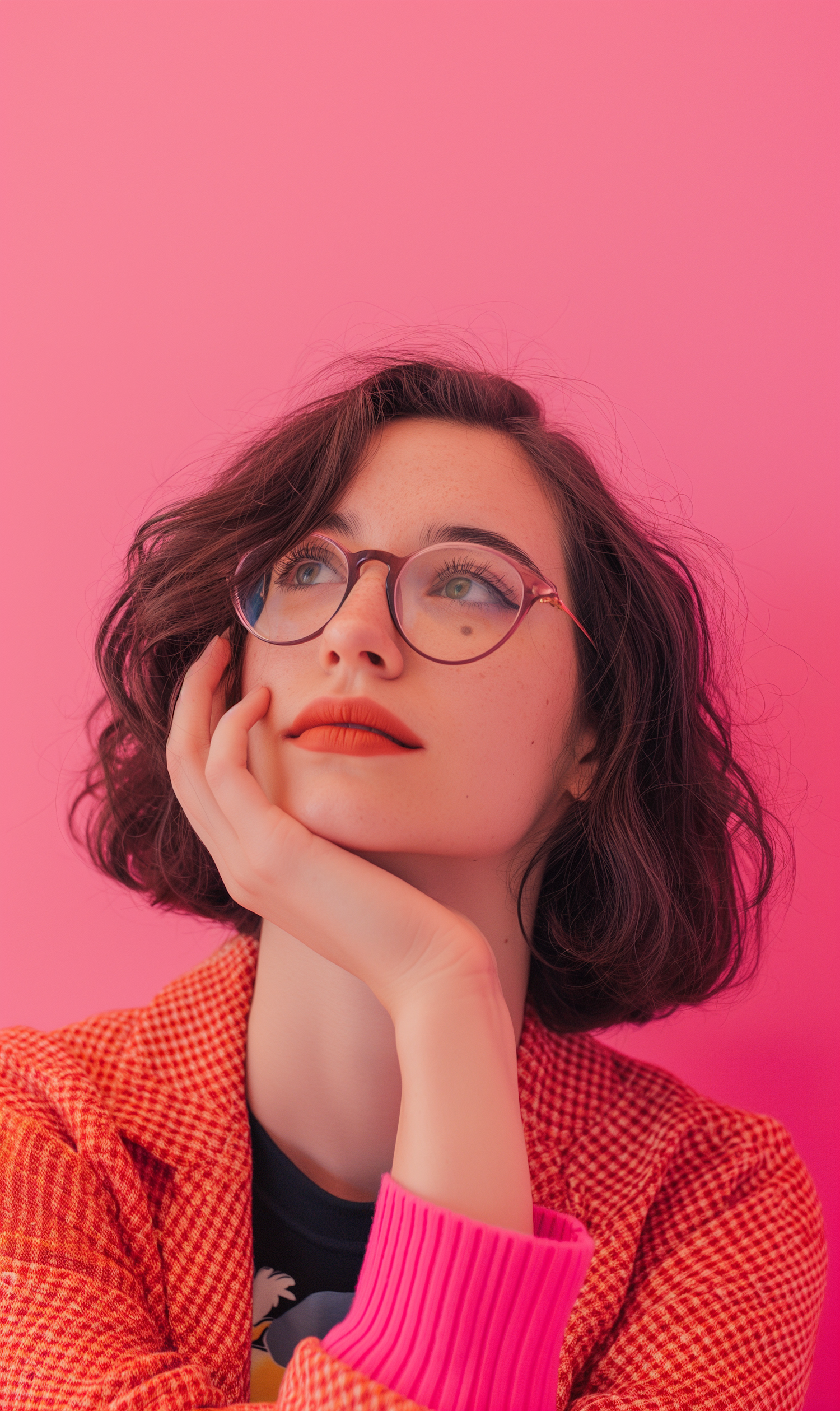 Vibrant portrait with blurred face, featuring short wavy brown hair, red checkered jacket, and pink background for a striking contrast.