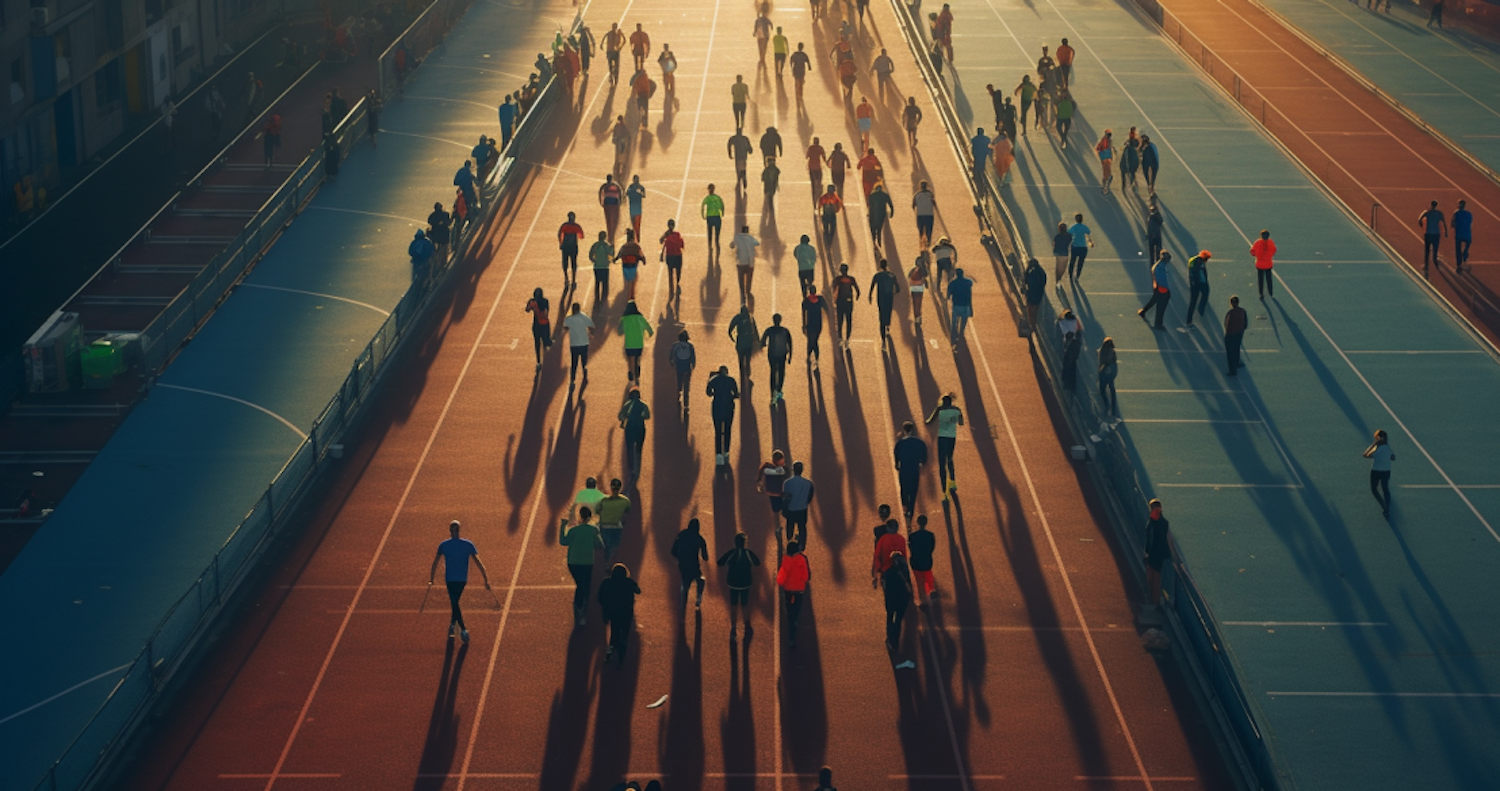 Aerial view of people walking on a colorful track field at sunset, casting long shadows. Vibrant athletic wear adds to the lively scene.