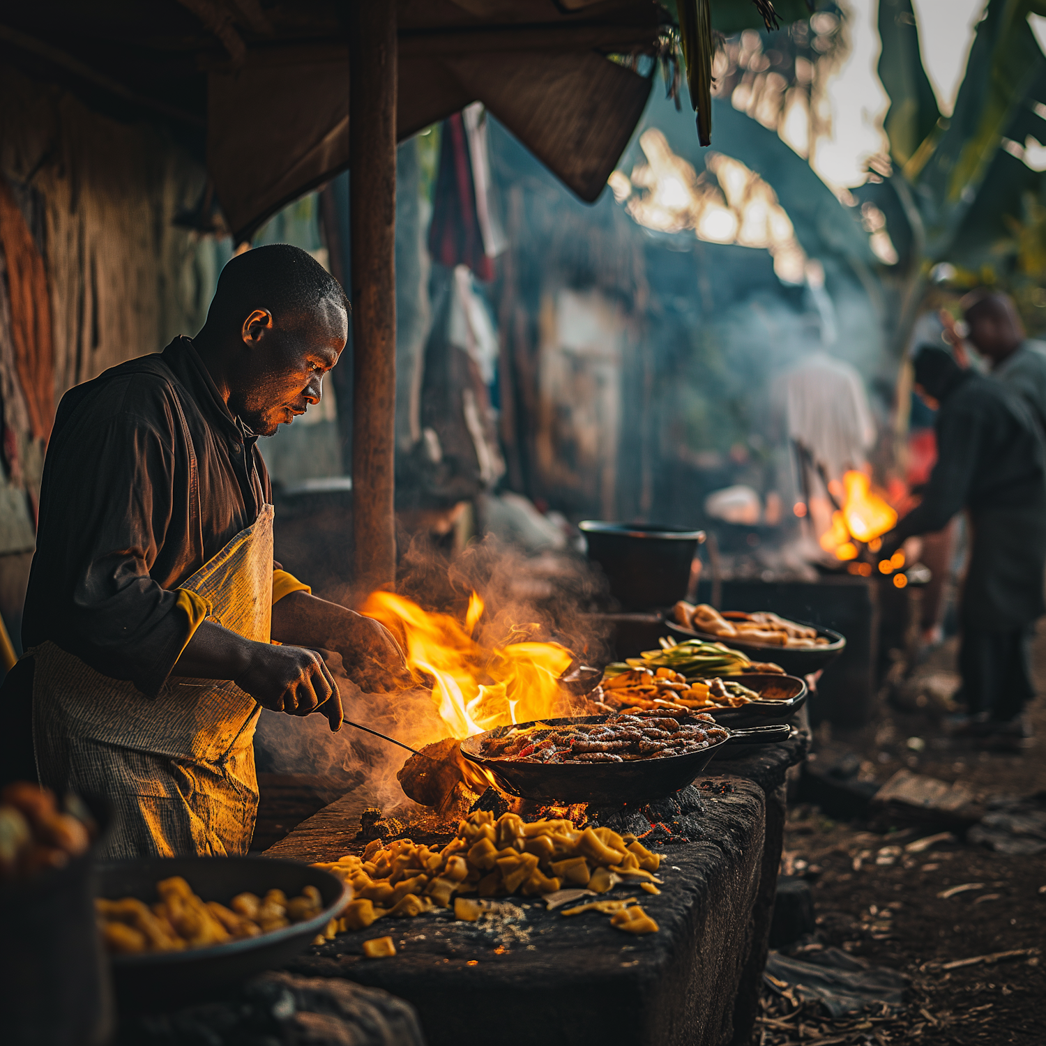 Street food vendor cooking over open flames, surrounded by vibrant ingredients and a lively market atmosphere.