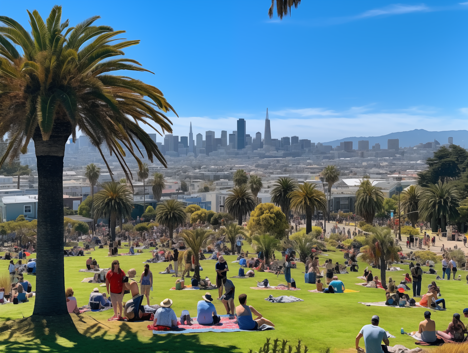 Sunny park scene with people relaxing on a lawn, palm trees, and a city skyline in the background under a clear blue sky.