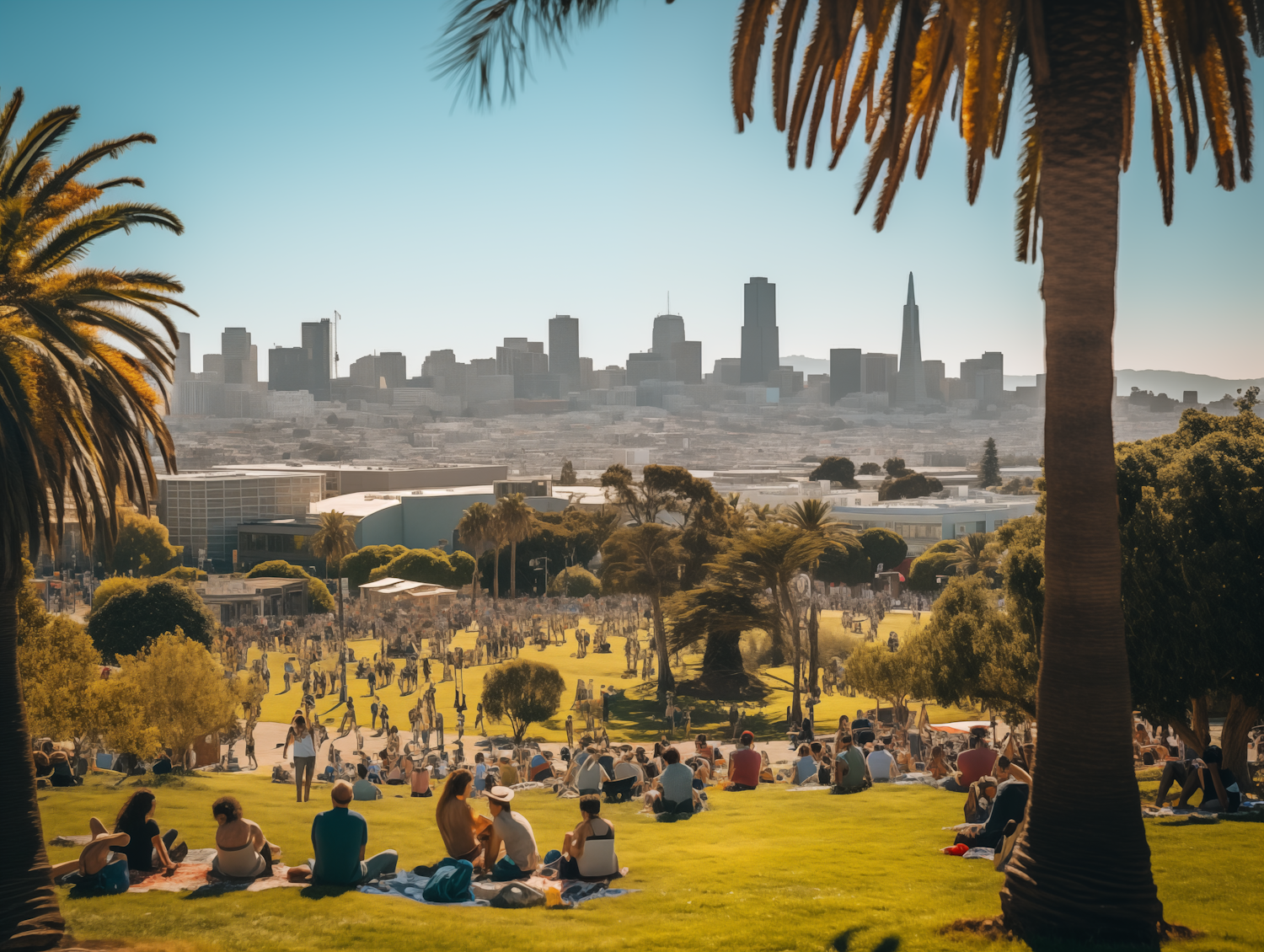Lively park scene with people relaxing on a sunny day, framed by palm trees and a city skyline in the background.