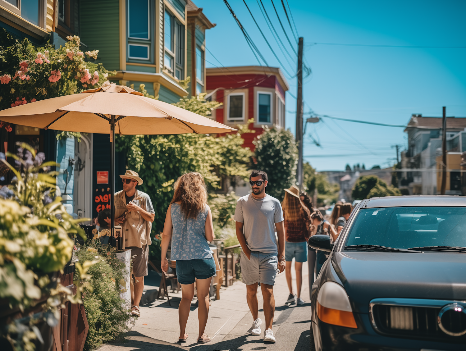 Sunny street scene with people walking, colorful buildings, and lush greenery. A man in sunglasses and a woman in denim shorts stand out.