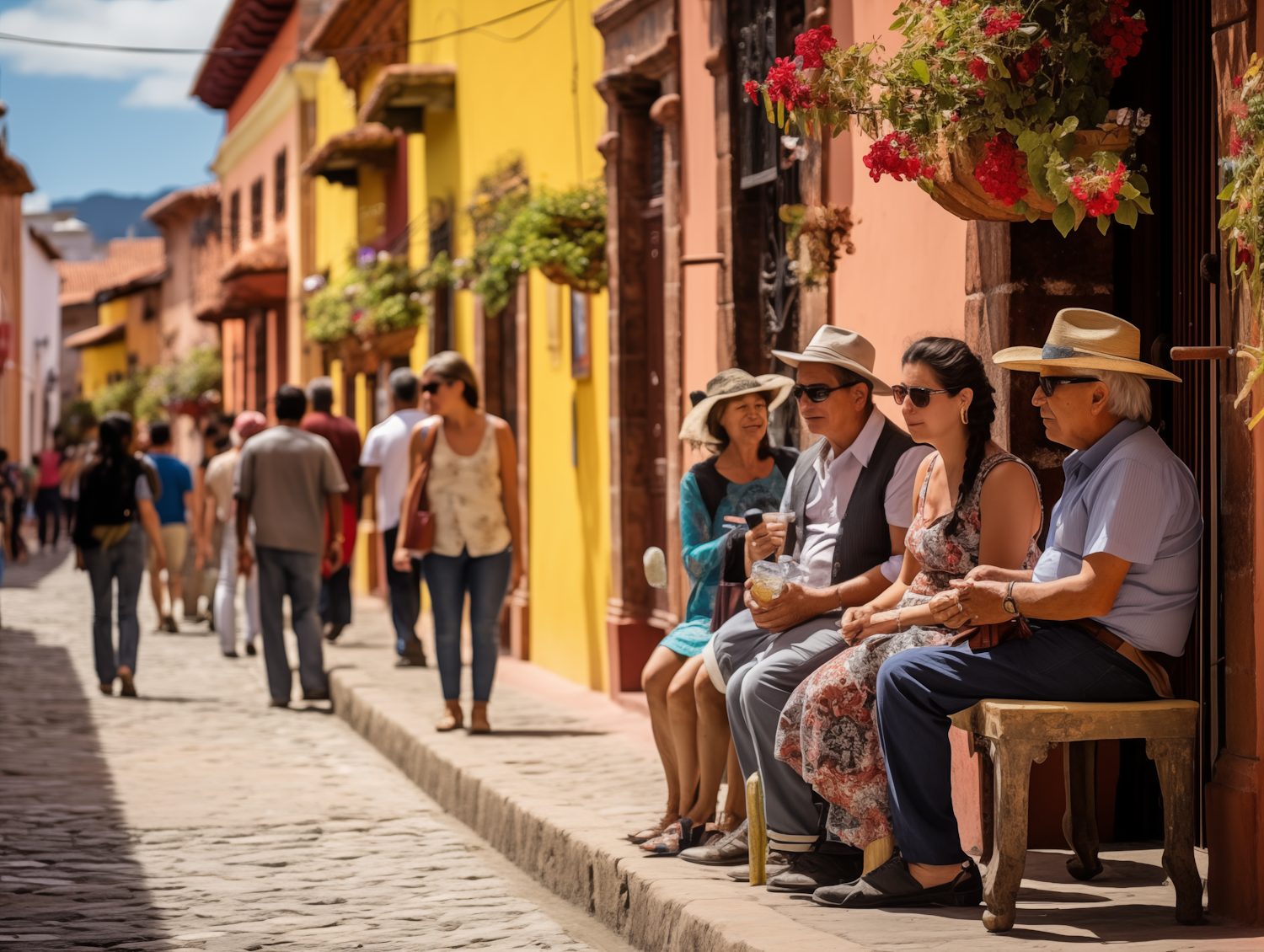 Vibrant street scene with colorful buildings, people relaxing on a bench, and pedestrians strolling on a sunny day.