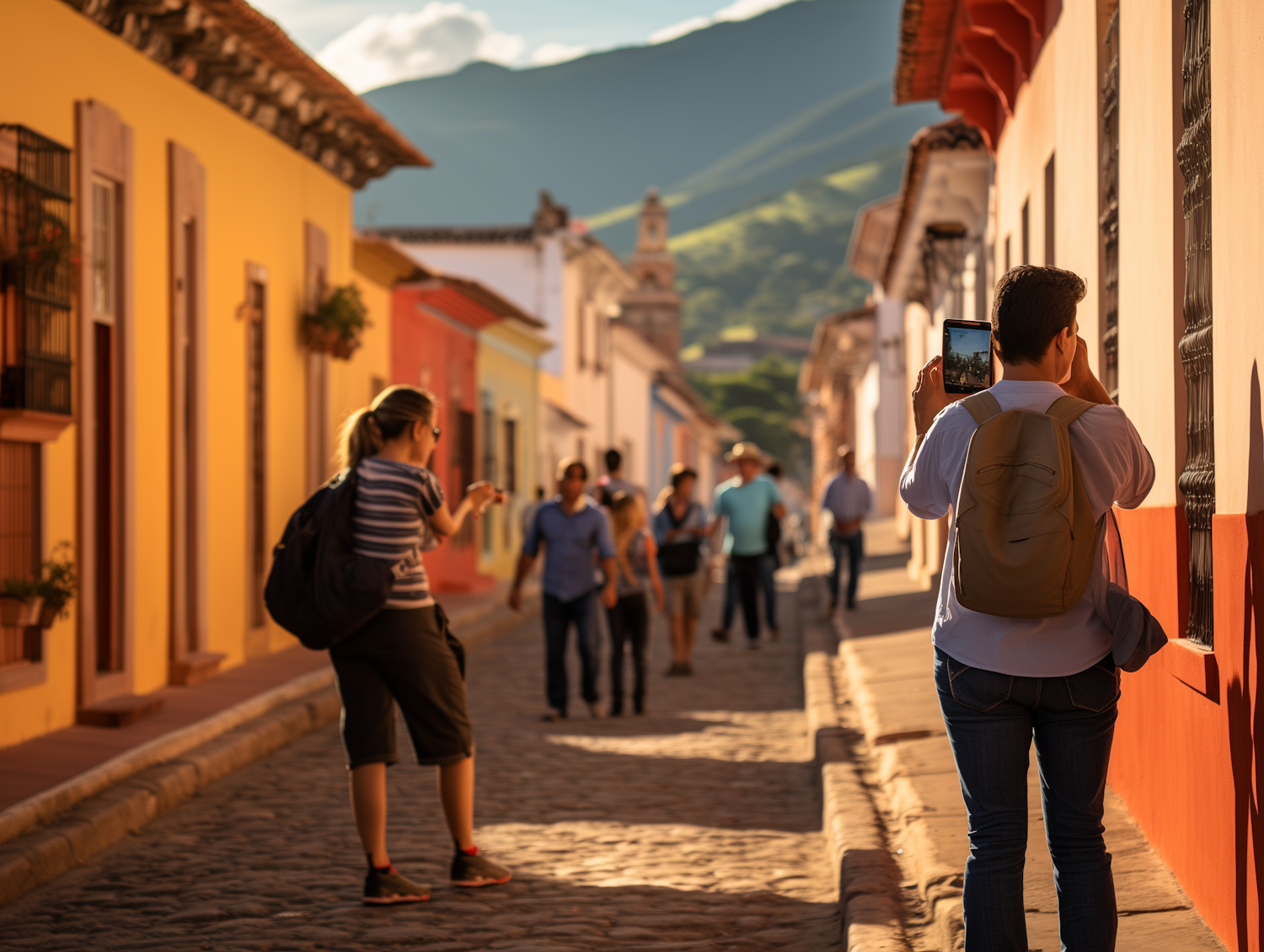 Colorful street scene with tourists capturing photos in a picturesque town, surrounded by vibrant buildings and lush hills.