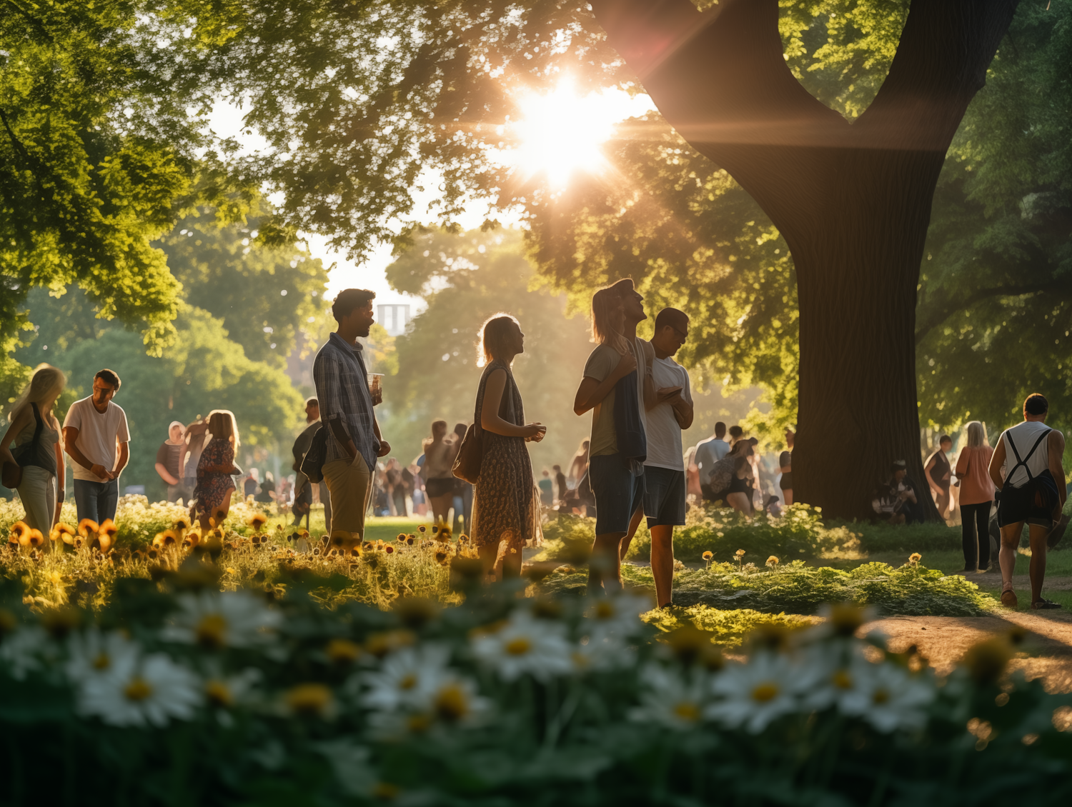 Sunlit park with diverse people enjoying a day out, surrounded by daisies and lush trees, under a warm golden glow.