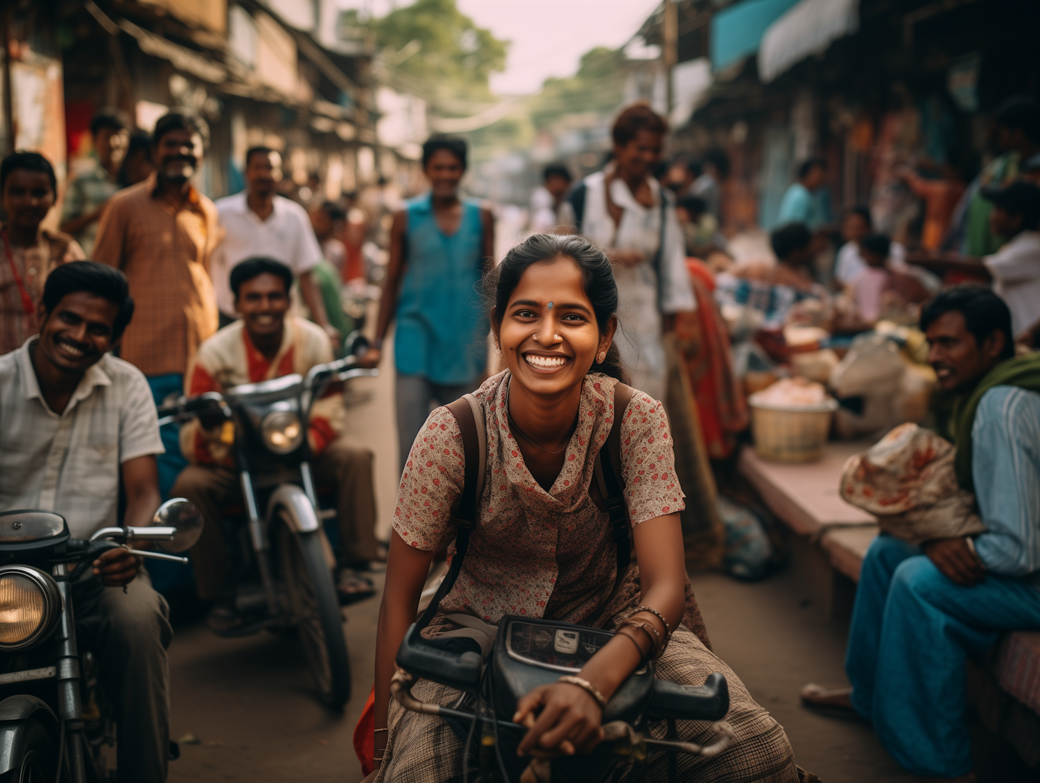 Joyful woman rides a bicycle through a bustling market, surrounded by smiling people and vibrant street life.