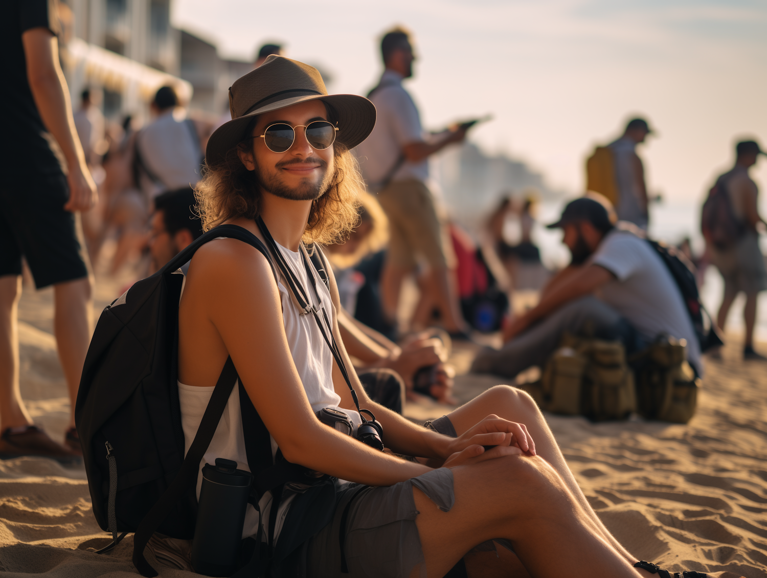 Young man with hat and sunglasses sitting on a busy beach, surrounded by people, with a camera and backpack, enjoying a sunny day.