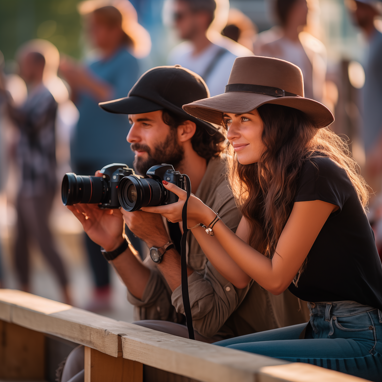 A young couple with cameras enjoys an outdoor event, capturing moments in warm, golden light.