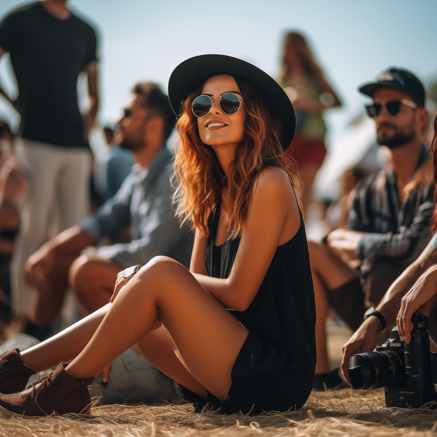 Young woman in a black dress and hat, smiling at an outdoor event, surrounded by people in a sunny, relaxed atmosphere.