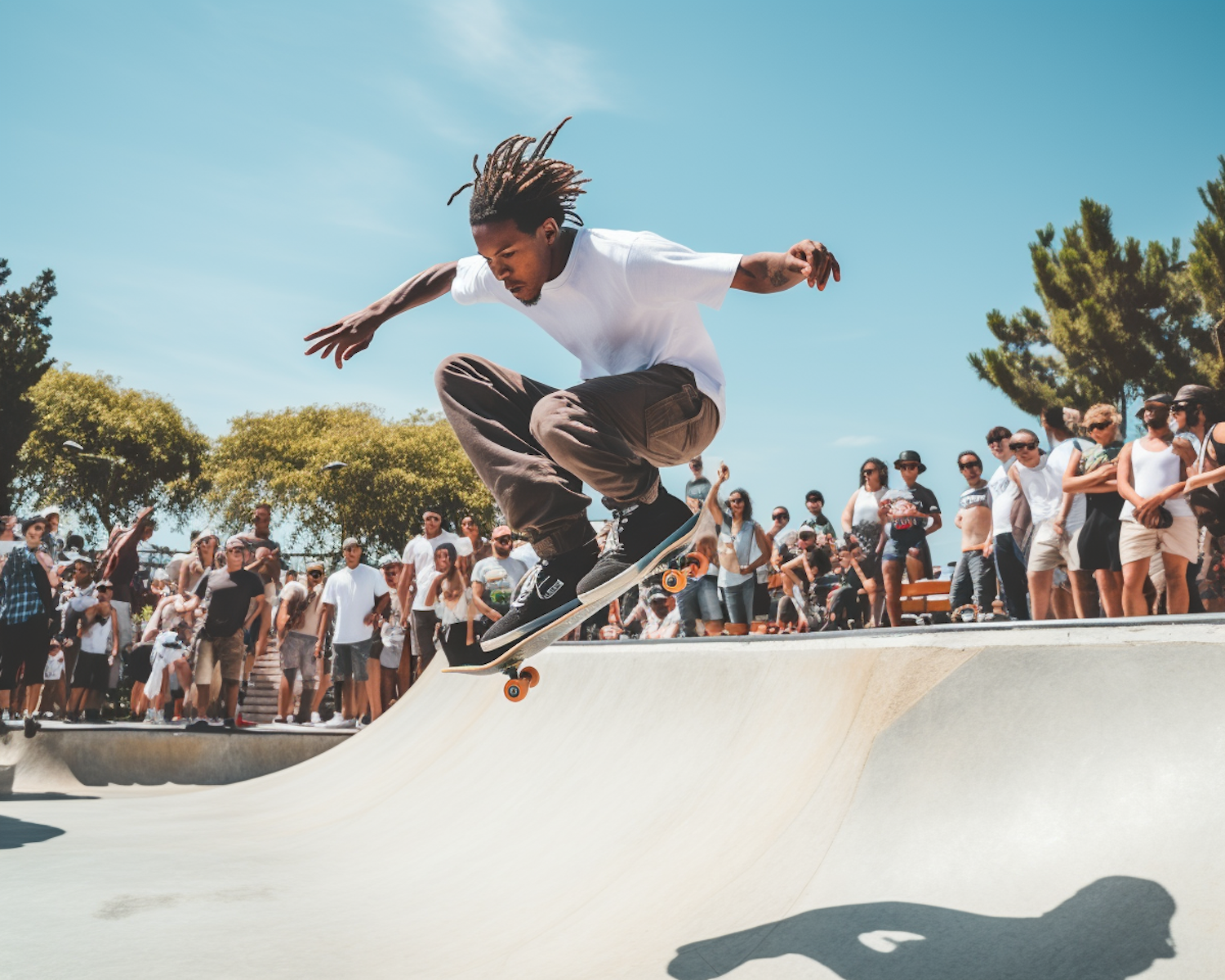 Airborne Skateboarder with Dreadlocks at a Community Skate Park