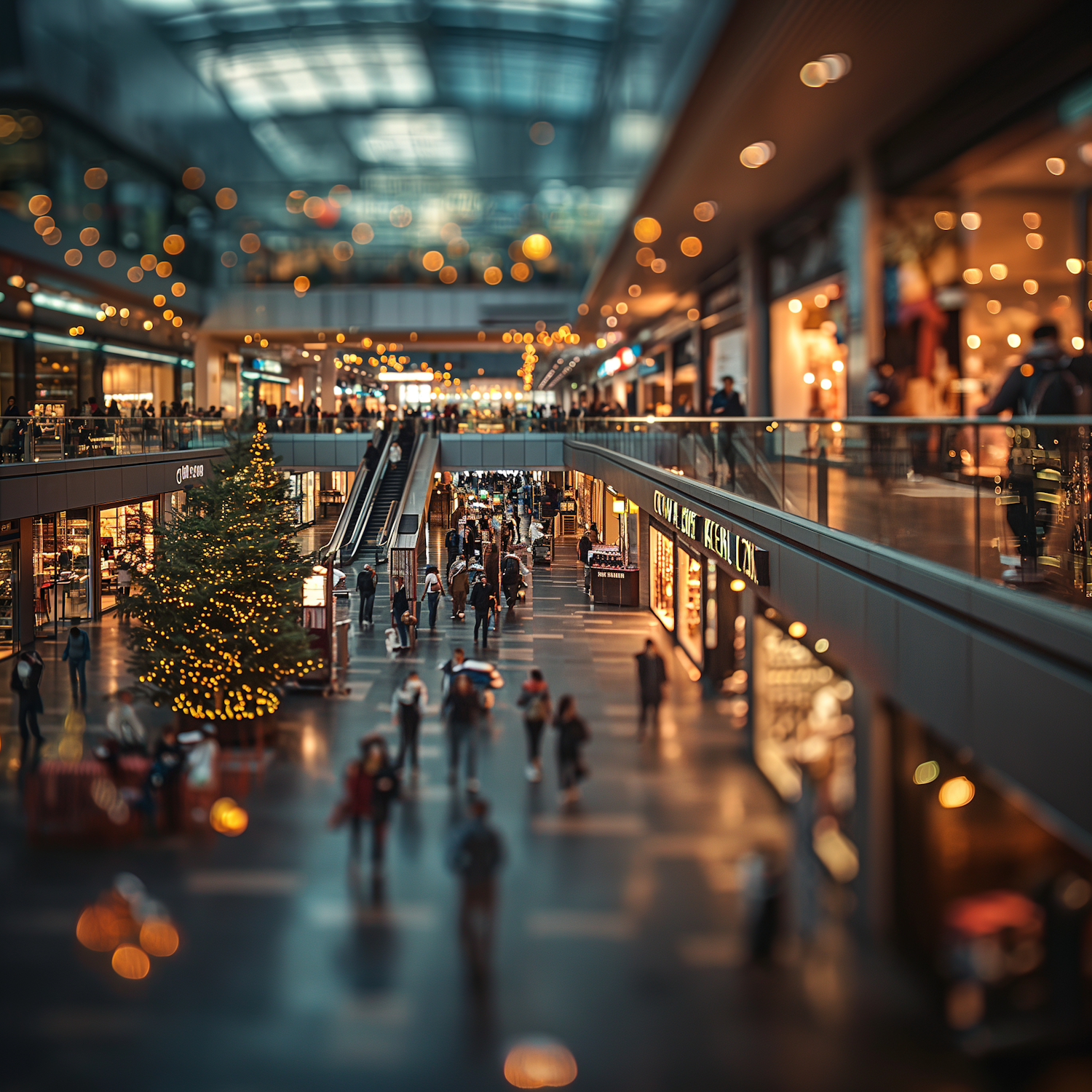 Festive shopping mall interior with a Christmas tree, bustling shoppers, and warm ambient lighting.