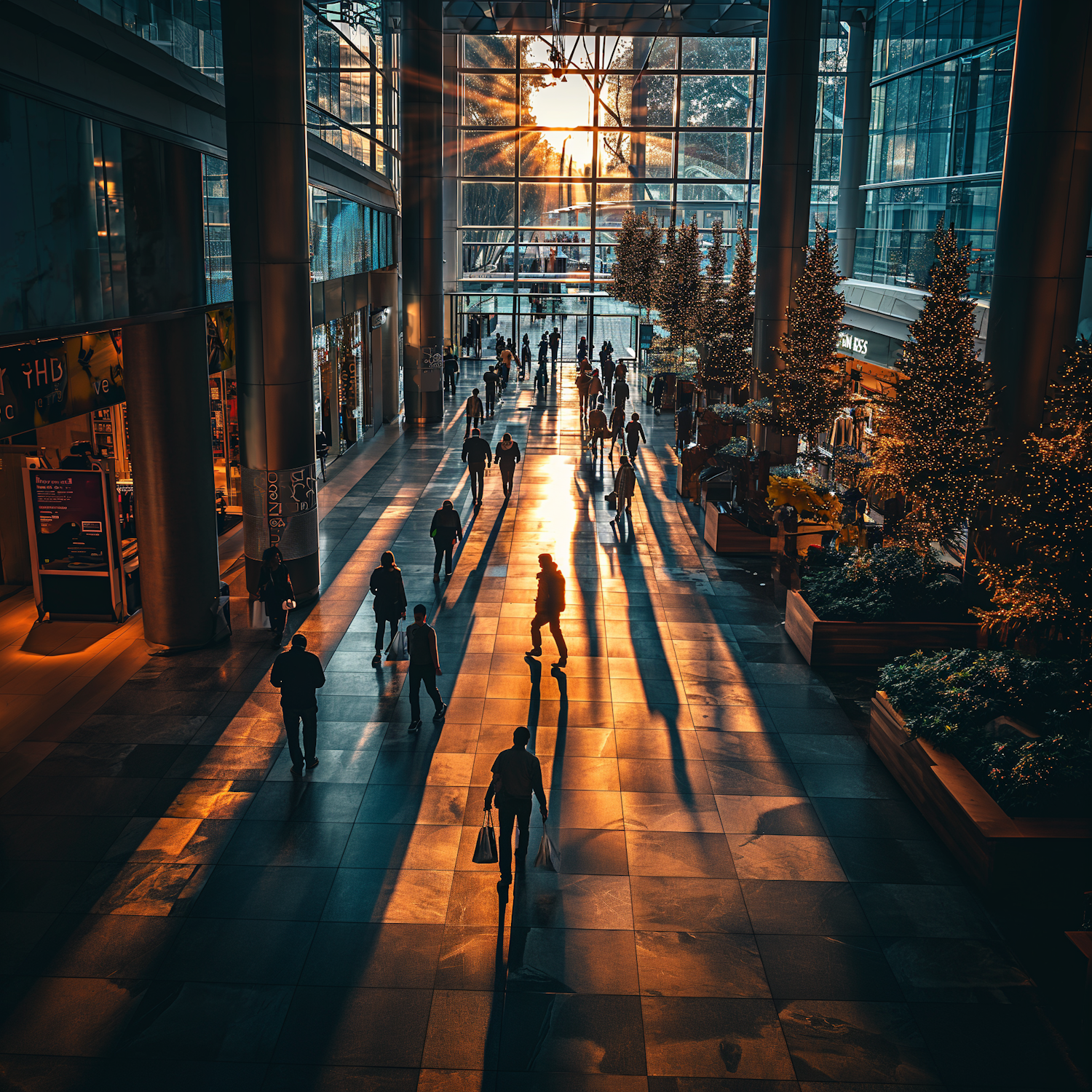 Sunlit atrium with people casting long shadows, surrounded by festive trees and modern architecture, creating a dynamic scene.