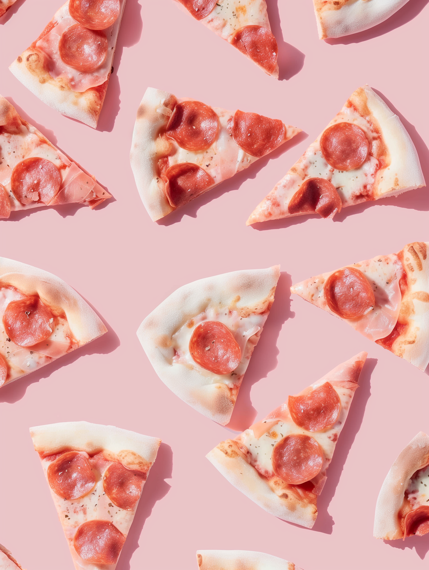 Flat lay of pepperoni pizza slices on a pastel pink background, creating a fun and vibrant food aesthetic.