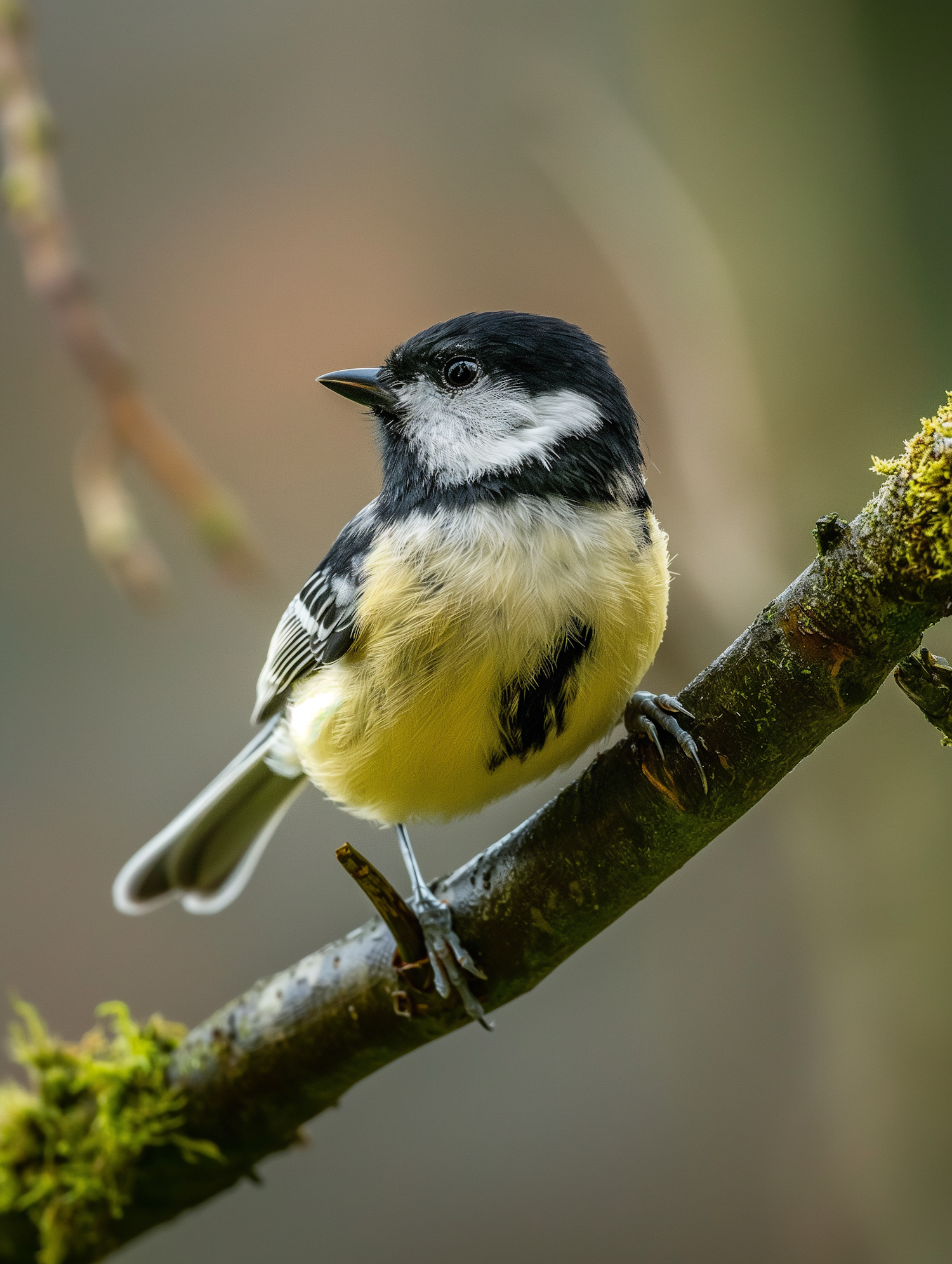 A small bird with black, white, and yellow plumage perched on a mossy branch against a blurred earthy background.