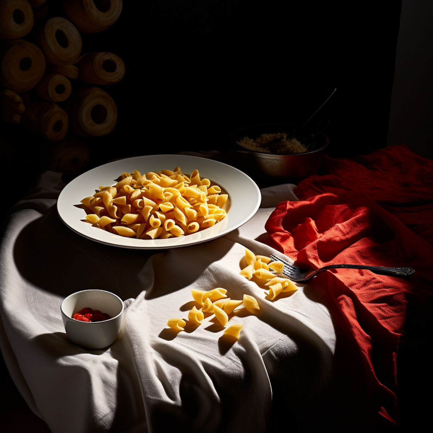 Rustic still life of uncooked pasta shells, tomato sauce, and cheese on a white tablecloth with dramatic lighting and vibrant red accents.