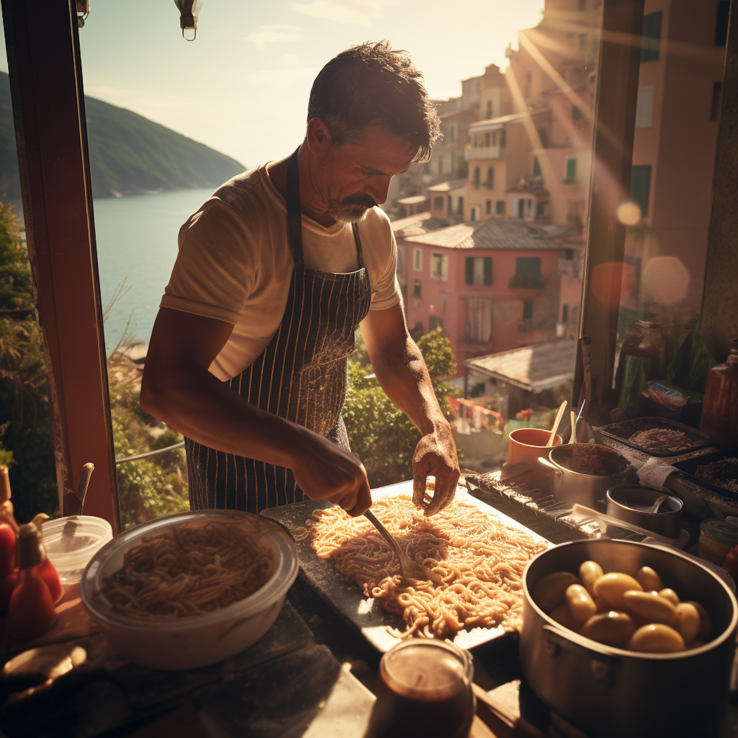 Man in a sunlit kitchen making pasta with a scenic coastal view outside the window.