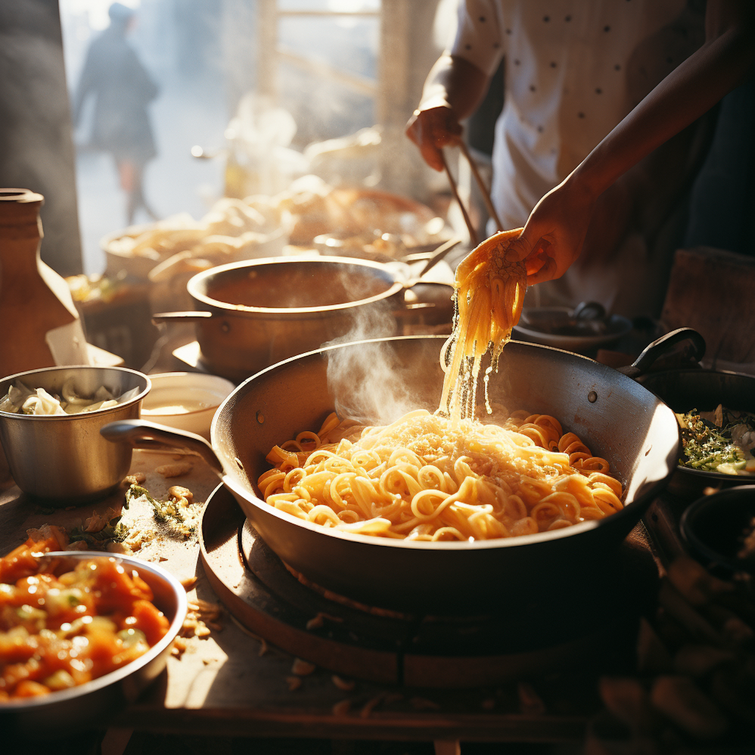 Steaming pasta being tossed in a bustling kitchen, surrounded by rustic cookware and fresh ingredients.