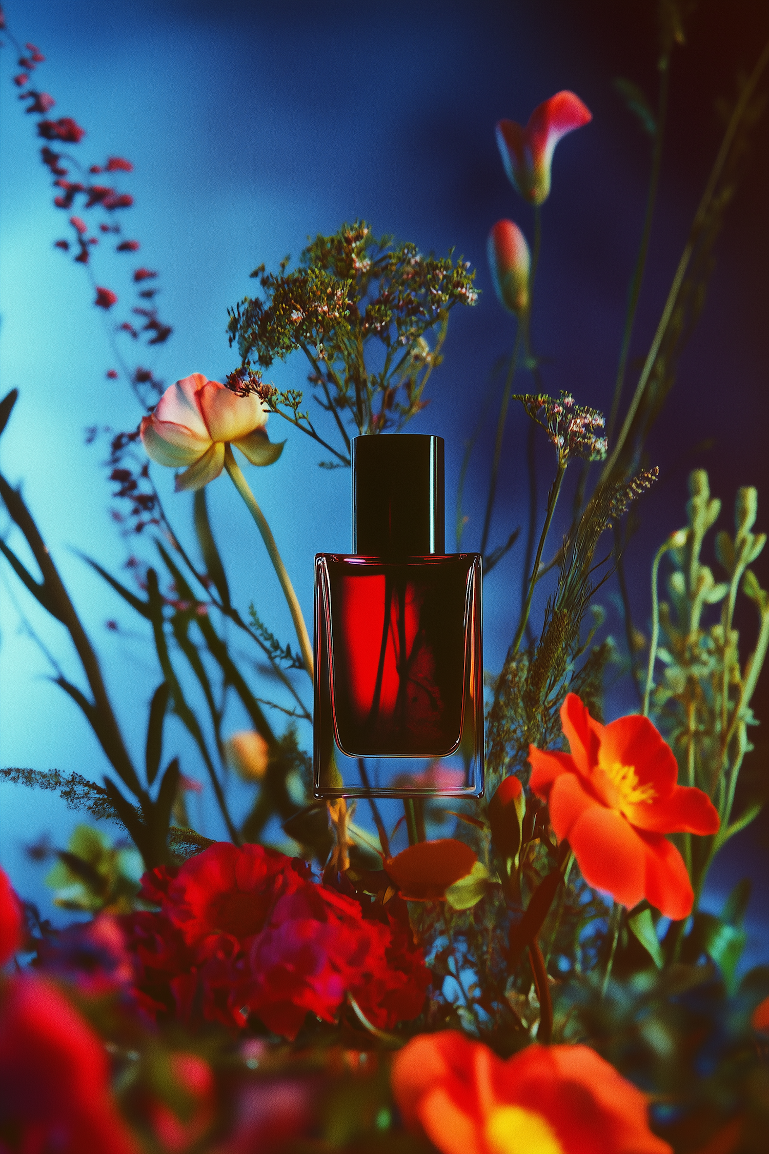 A sleek red perfume bottle surrounded by vibrant orange, red, and yellow flowers against a dramatic blue background.