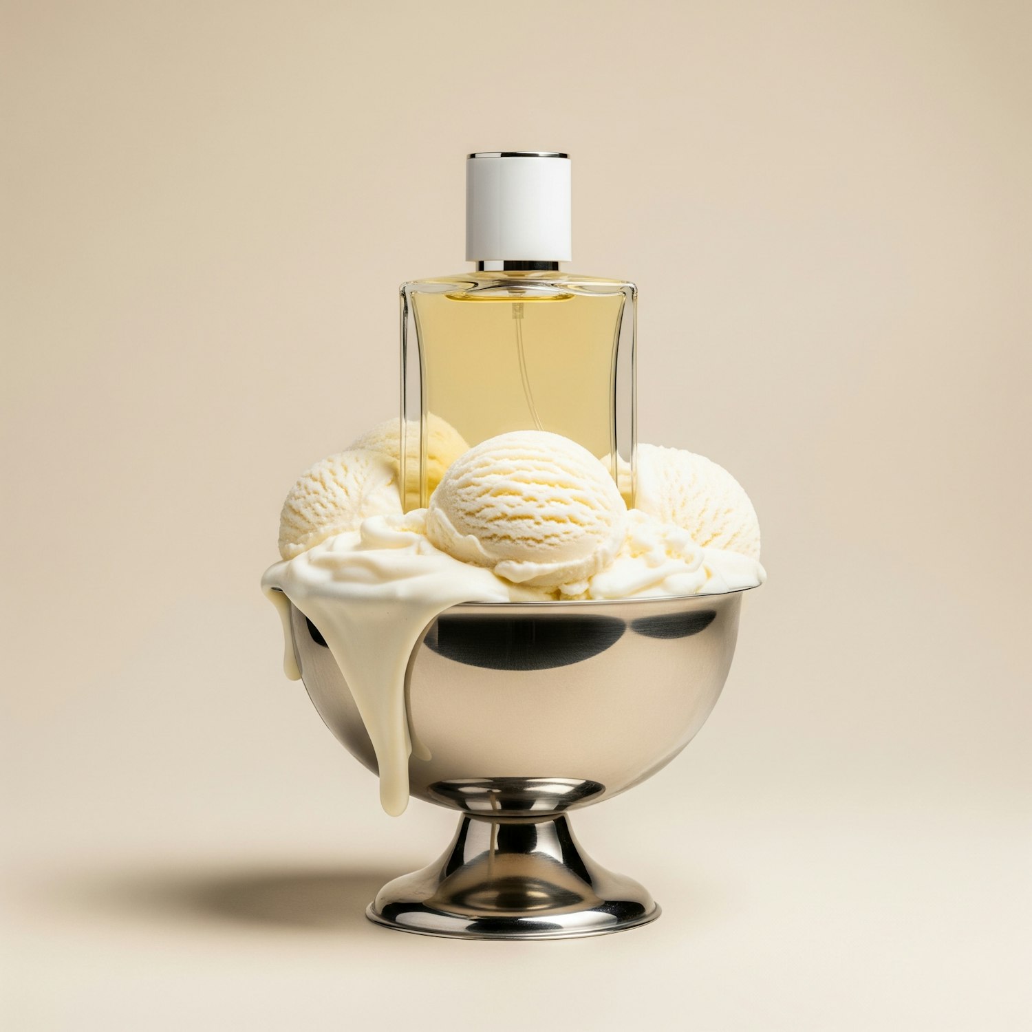 A sleek perfume bottle creatively displayed on a bowl of melting vanilla ice cream, blending luxury and indulgence in a unique composition.