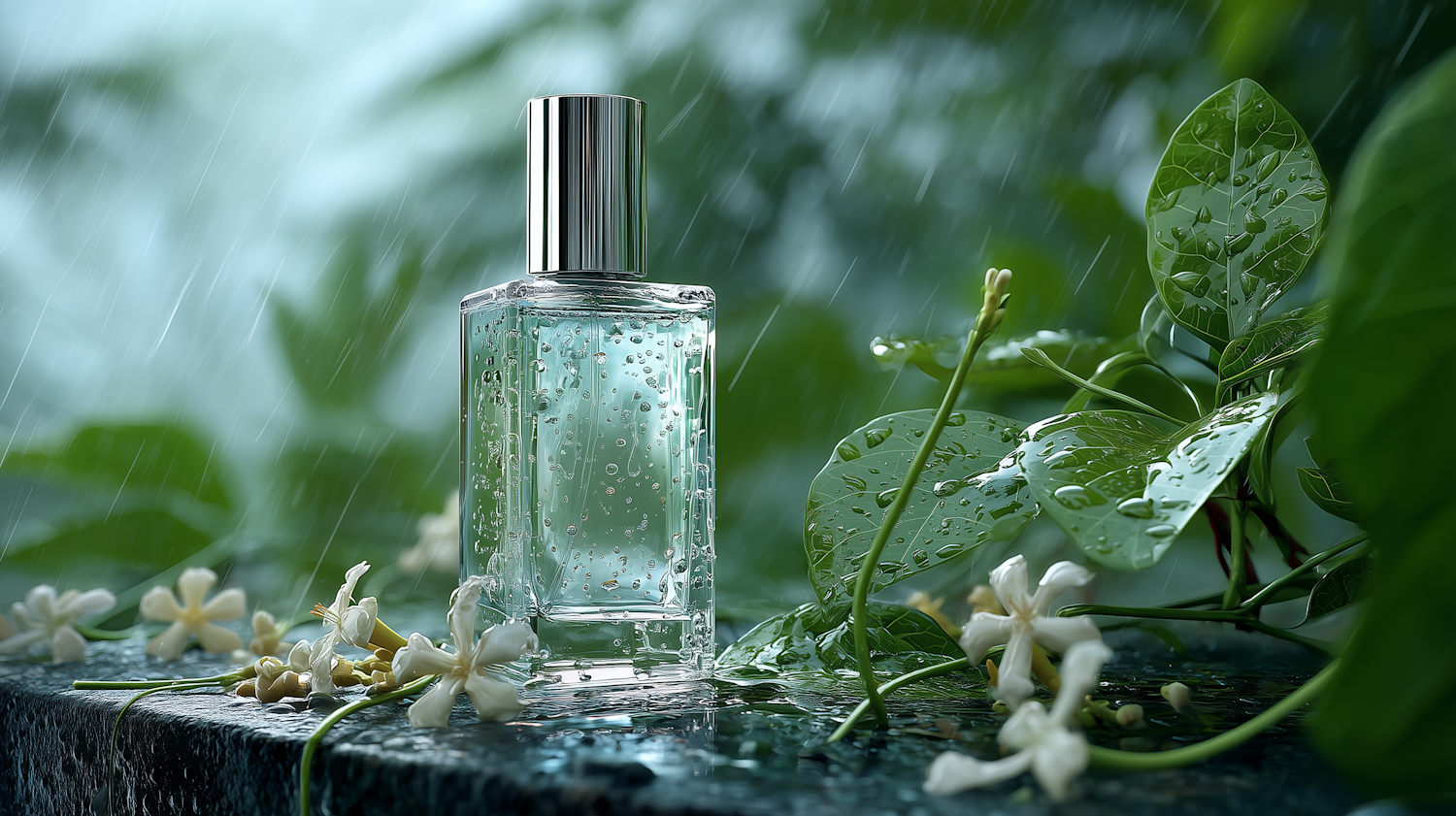 A dewy perfume bottle surrounded by jasmine flowers and lush green leaves in a serene rain-soaked setting. Perfect for nature-inspired fragrance ads.