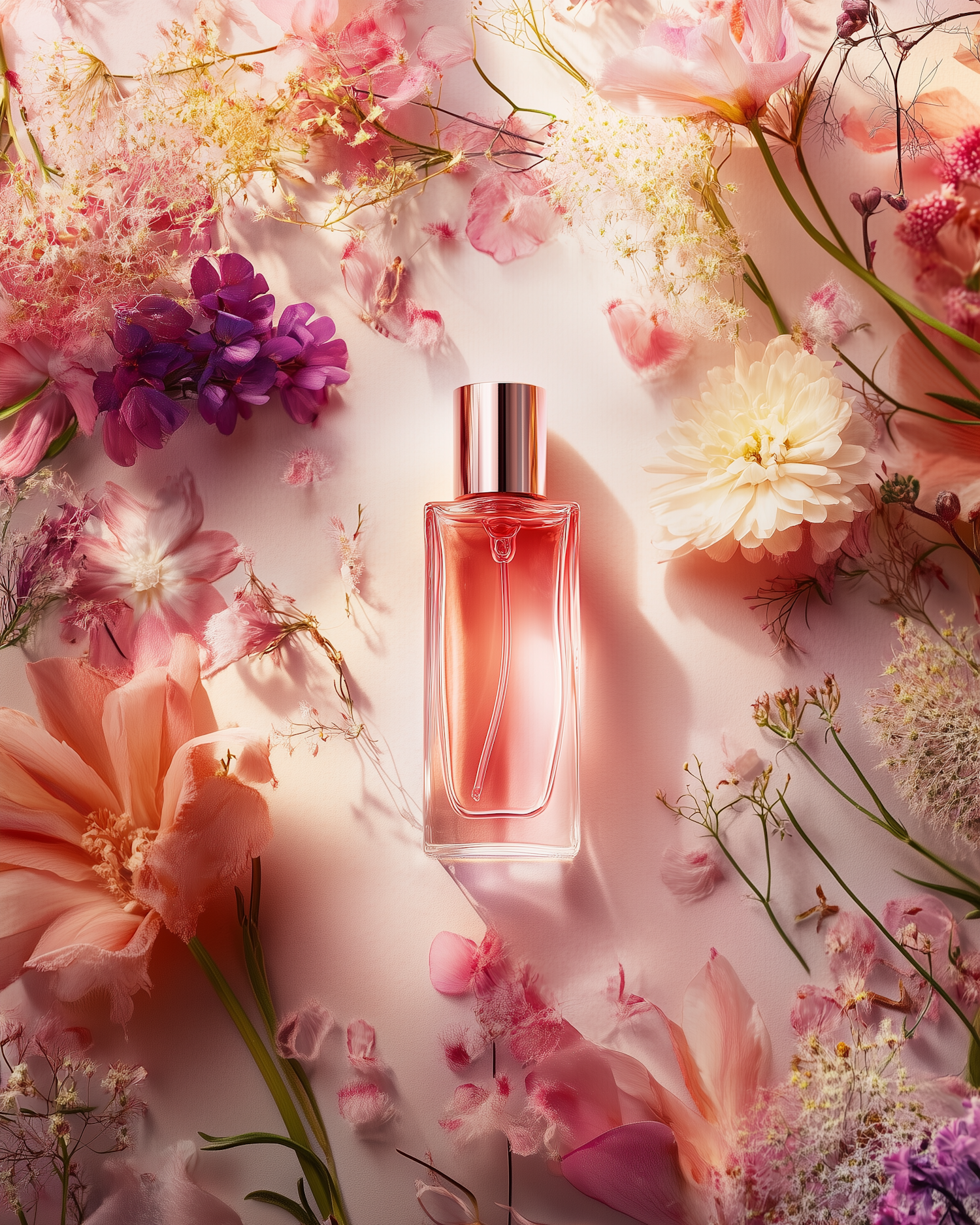 Elegant perfume bottle surrounded by pink and white flowers, creating a romantic and luxurious atmosphere.
