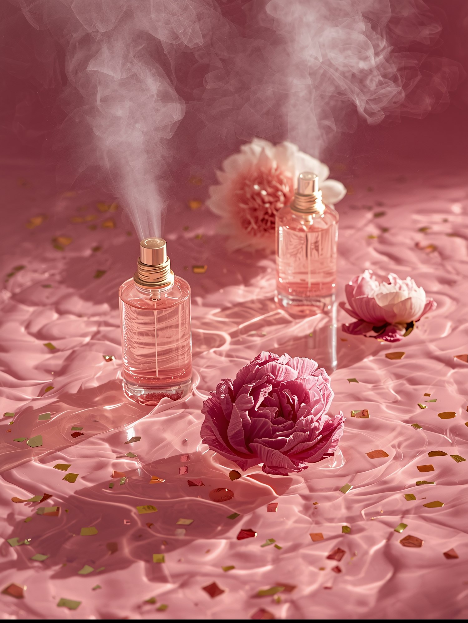 Two perfume bottles misting on a pink surface with flowers and confetti, creating a dreamy and luxurious aesthetic.