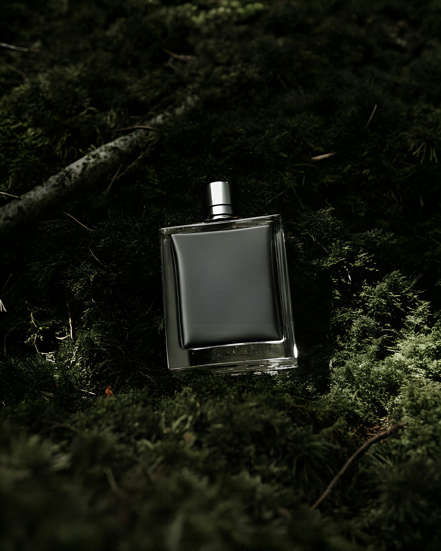 Minimalist perfume bottle on lush green moss, blending luxury and nature with sleek design and earthy textures.