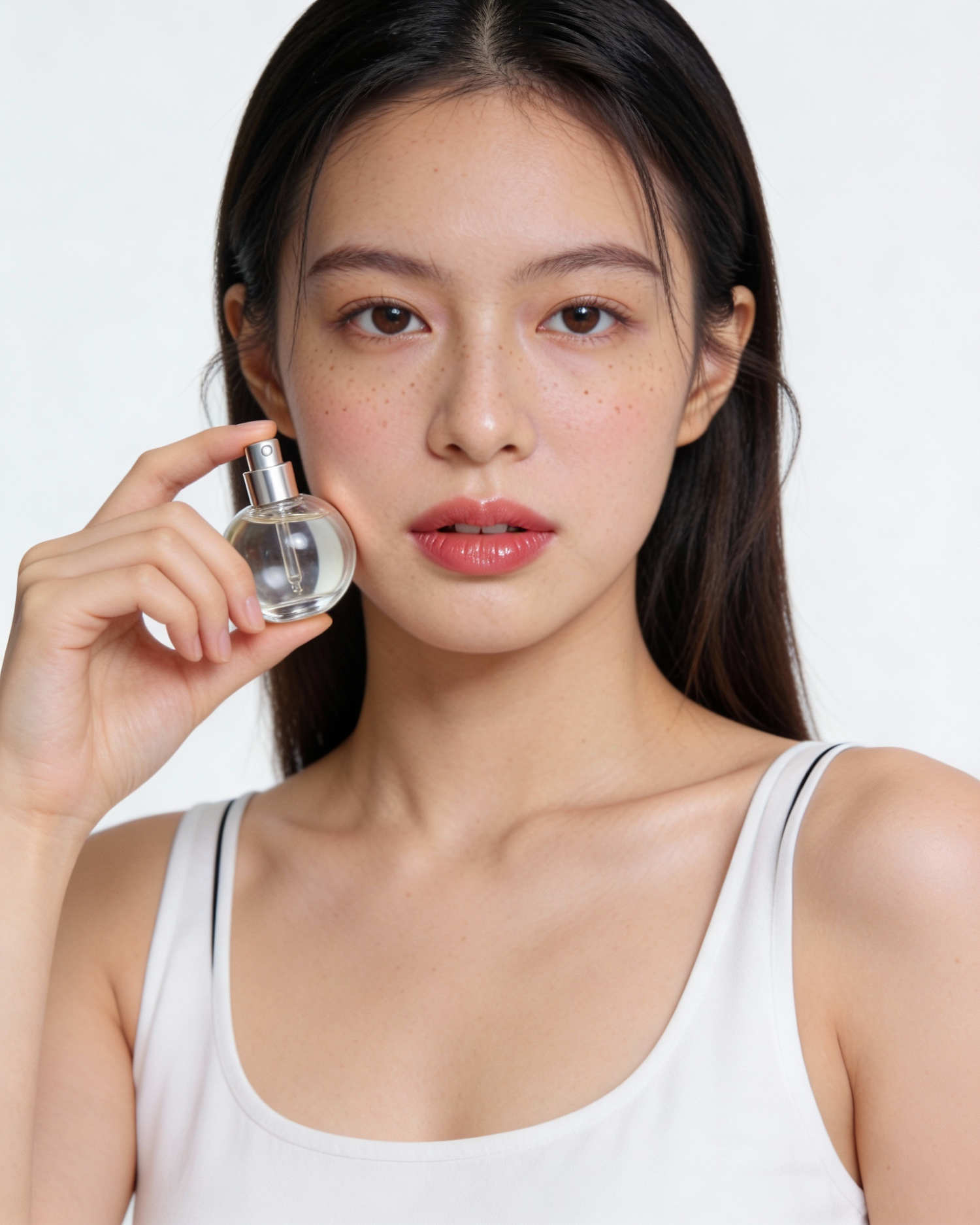 high-end beauty studio photography, professional fashion editorial lighting, soft diffused studio light, clean studio setup, shallow depth of field, sharp focus on subject, ultra realistic skin, natural beauty retouching, contemporary beauty campaign aesthetic, minimal composition, cinematic softness, 4:5 vertical format, young woman in her early twenties, delicate and fresh face, soft feminine features, clear skin, light freckles, glossy natural lips, subtle blush, minimal eye makeup, long straight hair slightly parted on one side, hair falling naturally over shoulders, the model is wearing a simple white sleeveless top with thin straps, clean and timeless, the model is standing facing the camera, upper body portrait, shoulders and head visible, she holds a small round transparent glass perfume bottle in her right hand near her cheek, the bottle is spherical, slightly flattened, with a smooth cylindrical cap, visible dropper inside, no logo, no text, minimalist cosmetic design, her expression is soft and innocent, relaxed mouth, slightly parted lips, calm gaze looking directly into the lens, solid white studio background, perfectly even and seamless, natural posture, soft elegance, subtle intimacy, product clearly visible but secondary to the emotion