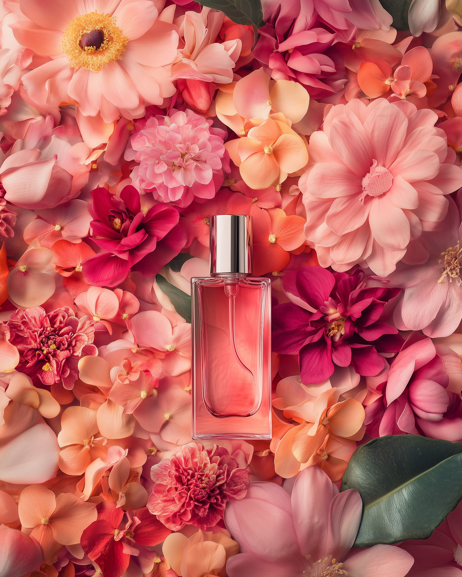 Elegant perfume bottle surrounded by vibrant pink and red flowers, creating a luxurious and fresh visual appeal.