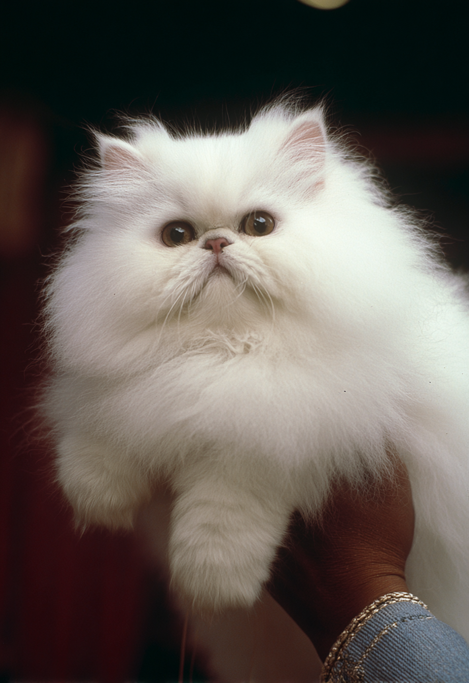 A fluffy white Persian cat with large expressive eyes, captured gracefully as it's held by a hand adorned with jewelry.