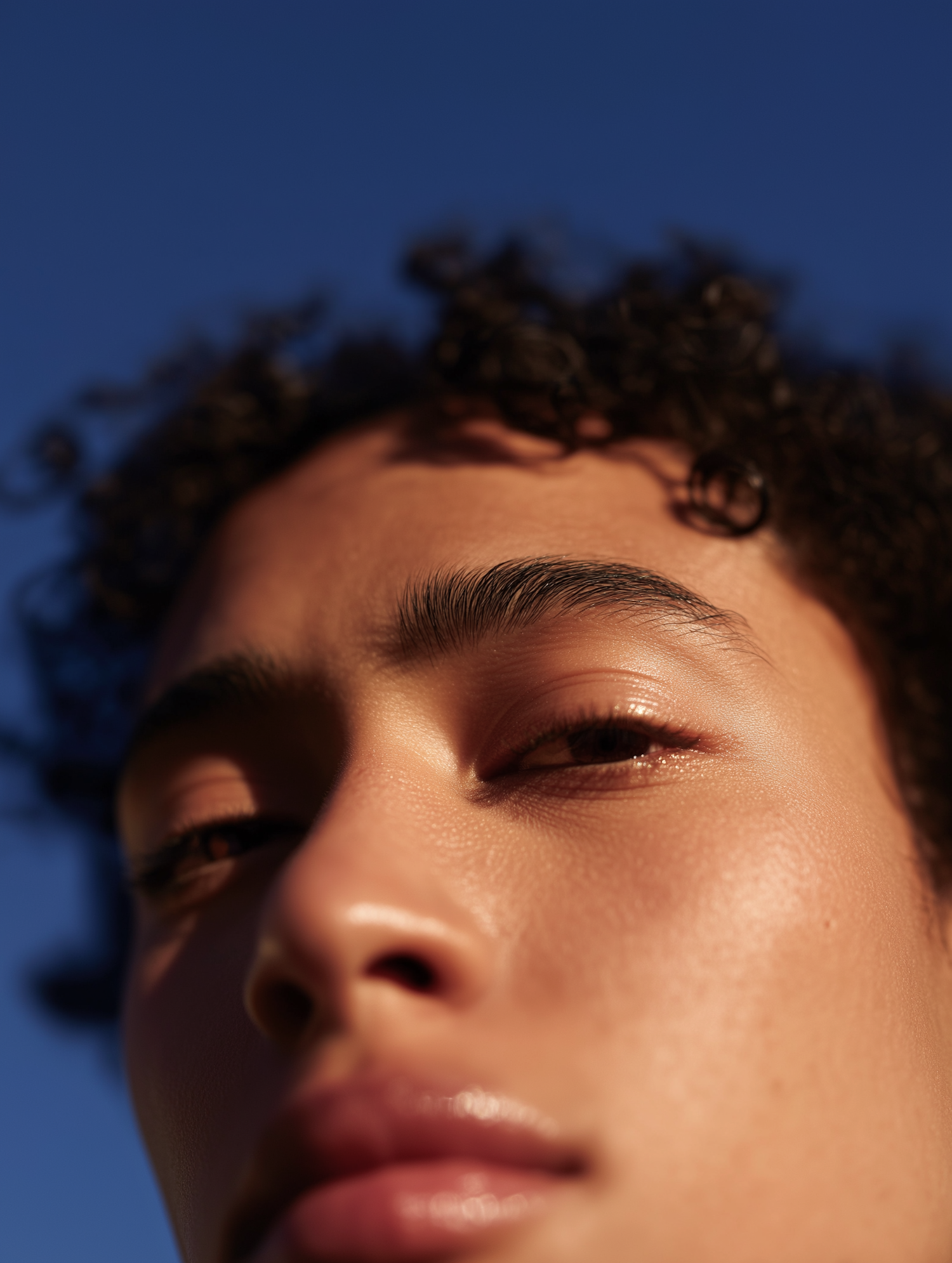 Artistic closeup of a face under vibrant blue sky, featuring soft lighting and focus on skin complexion and natural features.