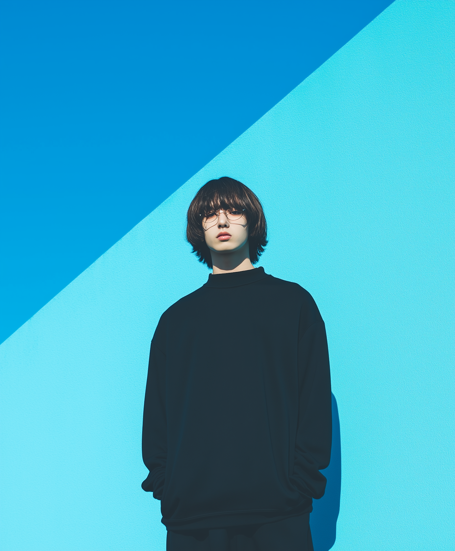 Minimalist portrait of a young person in black attire against a bold geometric blue background with natural lighting.
