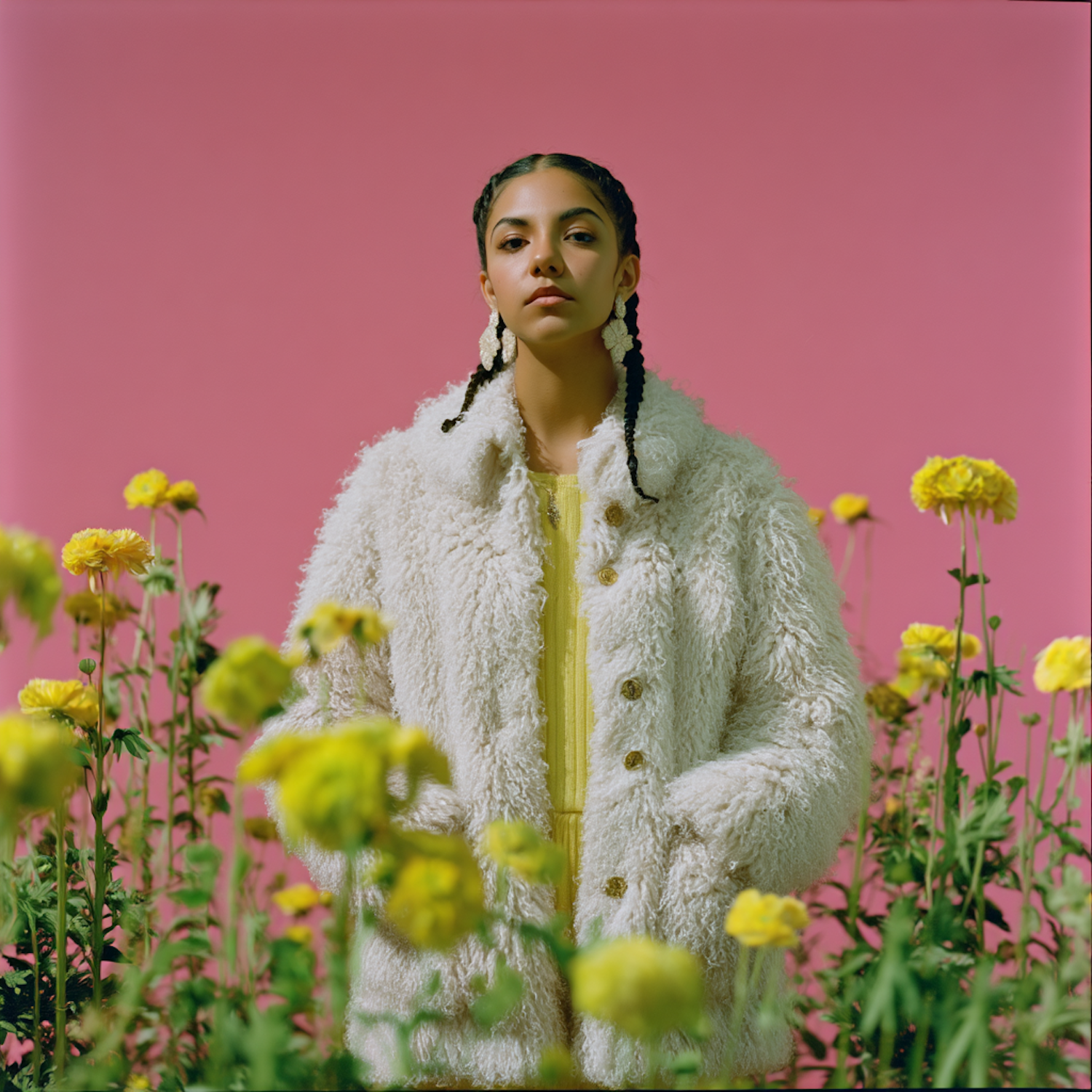 Portrait of a woman among yellow flowers, wearing a textured white coat against a pink backdrop.