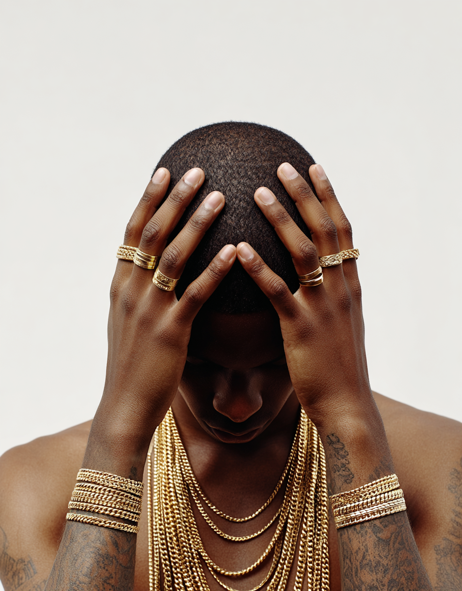 A close-up of a person's upper body, hands on their head, adorned with intricate gold jewelry, showcasing bold self-expression.