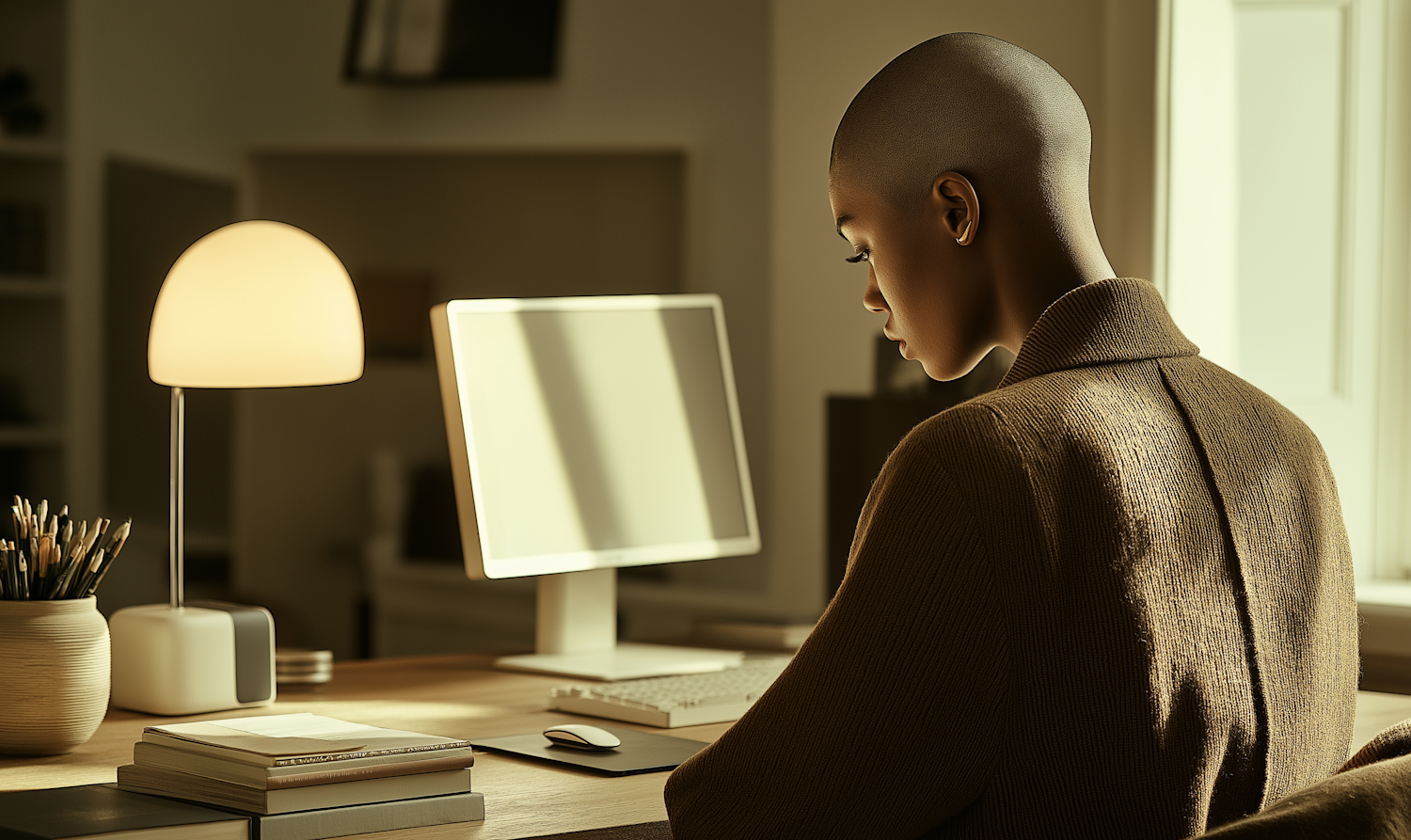 A person with a shaved head works at a desk with a computer, books, and a warm lamp, creating a serene and focused atmosphere.