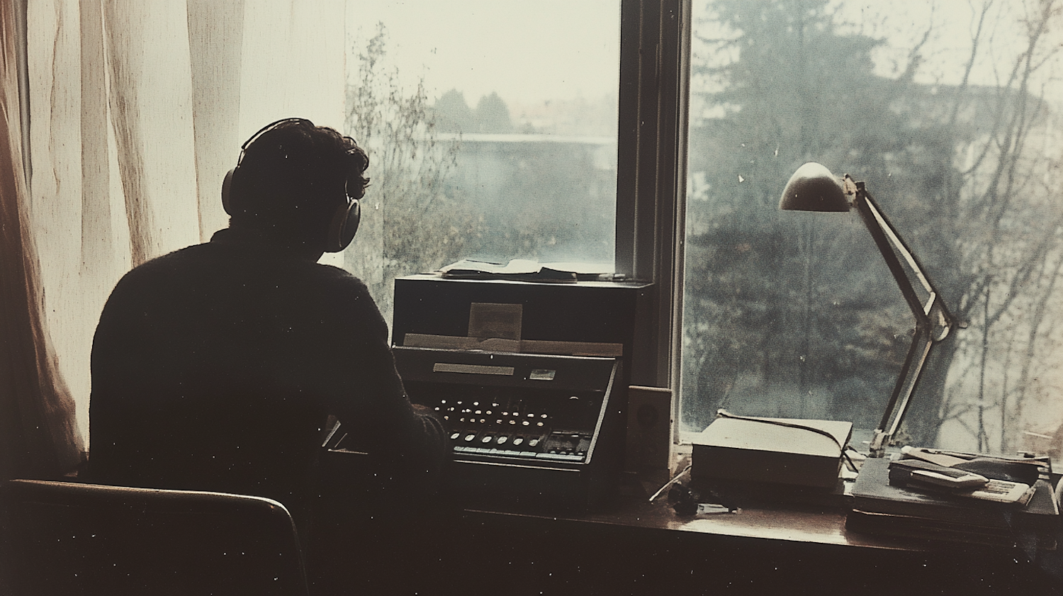 Silhouetted person with headphones at a desk, vintage audio mixer, and window view. Retro, nostalgic atmosphere.