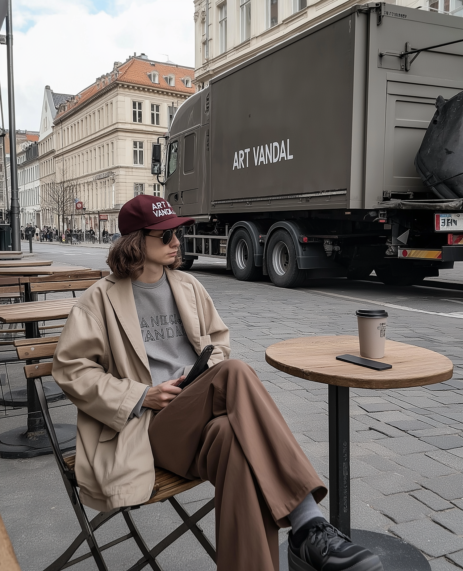 Person in stylish outfit sits at café with 'ART VANDAL' truck in background, holding phone and coffee cup on table.
